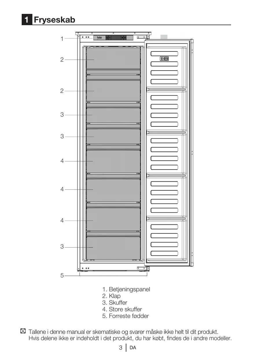 5 1. Betjeningspanel 2. Klap 3. Skuffer 4. Store skuffer 5. Forreste fødder