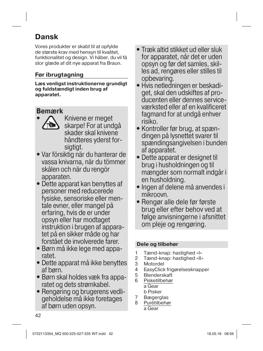 • Træk altid stikket ud eller sluk for apparatet, når det er uden opsyn og før det samles, skilles ad, rengøres eller stilles til opbevaring. • Hvis netledningen er beskadiget, skal den udskiftes af producenten eller dennes serviceværksted eller af en kvalificeret fagmand for at undgå enhver risiko. • Kontroller før brug, at spændingen på lysnettet svarer til spændingsangivelsen i bunden af apparatet. • Dette apparat er designet til brug i husholdningen og til mængder som normalt indgår i en husholdning. • Ingen af delene må anvendes i mikroovn. • Rengør alle dele før første brug eller efter behov ved at følge anvisningerne i afsnittet om pleje og rengøring. Dele og tilbehør 1 2 3 4 5 6 7 8