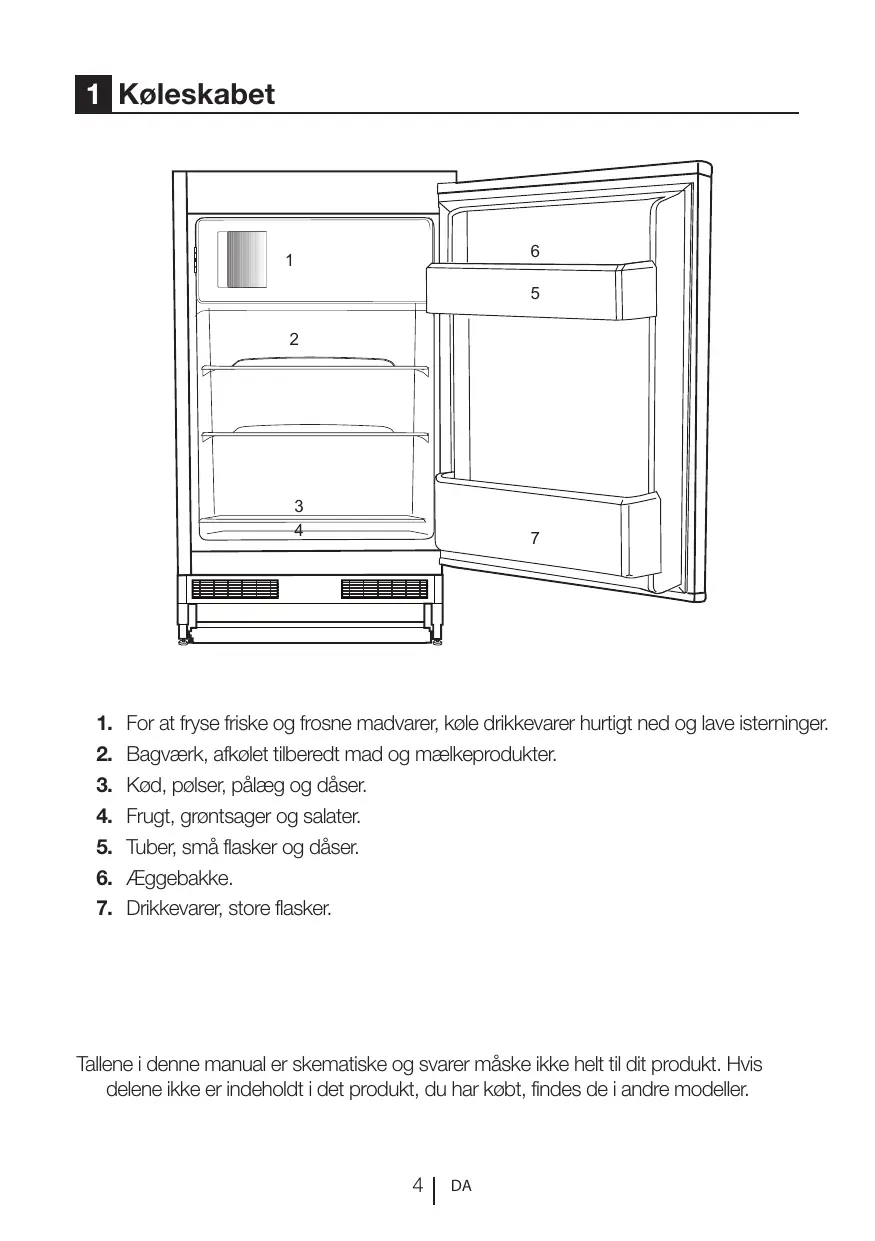 A ADVARSEL: Opbevar ikke eksplosive stoffer, såsom spraydåser med brændbare drivgasser i køleskabet. 5