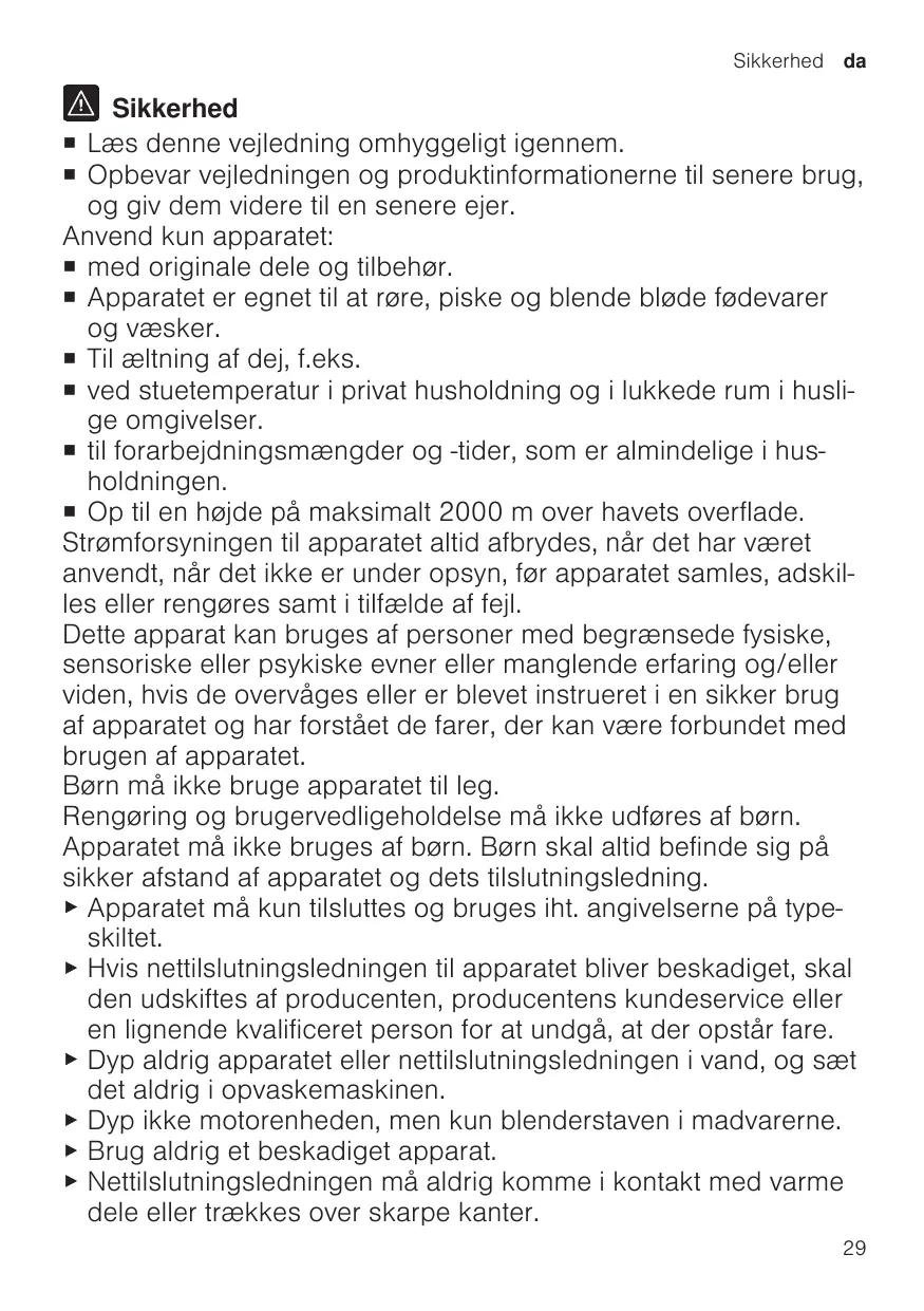 ¡ pour mélanger, battre et mixer des aliments tendres et des liquides. ¡ pour pétrir de la pâte molle. ¡ pour un usage domestique privé et dans les pièces fermées d’un domicile, à la température ambiante. ¡ pour les quantités de préparation et durées de traitement habituelles pour un ménage. ¡ à une hauteur maximale de 2000 m au-dessus du niveau de la mer. L’appareil doit toujours être débranché du secteur, après chaque utilisation, lorsqu’il n’est pas sous surveillance, lorsqu’il doit être monté ou démonté, avant de le nettoyer et en cas de panne. Cet appareil peut être utilisé par des personnes aux capacités physiques, sensorielles ou mentales réduites ou des personnes inexpérimentées, à condition qu'elles soient surveillées ou qu'elles aient été informées de l'utilisation de l'appareil et qu'elles comprennent les risques inhérents à son usage. Les enfants ne sont pas autorisés à jouer avec l'appareil. Le nettoyage et l’entretien de l'appareil ne doivent pas être effectués par des enfants. L'appareil ne doit pas être utilisé par des enfants. Les enfants doivent être tenus à distance de l’appareil et du cordon d’alimentation secteur. ▶ Pour le raccordement et l’utilisation de l’appareil, respectez impérativement les indications figurant sur la plaque signalétique. ▶ Afin d’écarter tout danger quand le cordon d’alimentation secteur de cet appareil est endommagé, seul le fabricant ou son service après-vente ou toute autre personne de qualification équivalente est habilité à le remplacer. 17