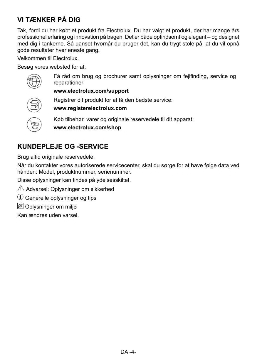 élégant, il a été conçu pour vous. Ainsi, chaque fois que vous l’utilisez, vous pouvez être sûr d’obtenir d’excellents résultats. Bienvenue dans l’univers d’Electrolux. N’hésitez pas à consulter notre site Web pour : Obtenir des conseils d’utilisation, des brochures, un service de dépannage, des informations sur l’entretien et les réparations : www.electrolux.com/support Enregistrer votre produit pour un meilleur service : www.registerelectrolux.com Acheter des accessoires, des consommables et des pièces de rechange d’origine pour votre appareil : www.electrolux.com/shop