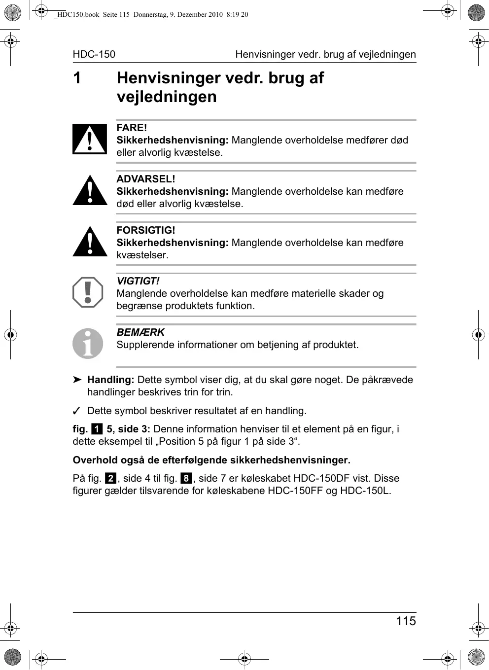 ➤ Handling: Dette symbol viser dig, at du skal gøre noget. De påkrævede handlinger beskrives trin for trin. ✓ Dette symbol beskriver resultatet af en handling. fig. 1 5, side 3: Denne information henviser til et element på en figur, i dette eksempel til „Position 5 på figur 1 på side 3“. Overhold også de efterfølgende sikkerhedshenvisninger. På fig. 2, side 4 til fig. 8, side 7 er køleskabet HDC-150DF vist. Disse figurer gælder tilsvarende for køleskabene HDC-150FF og HDC-150L.