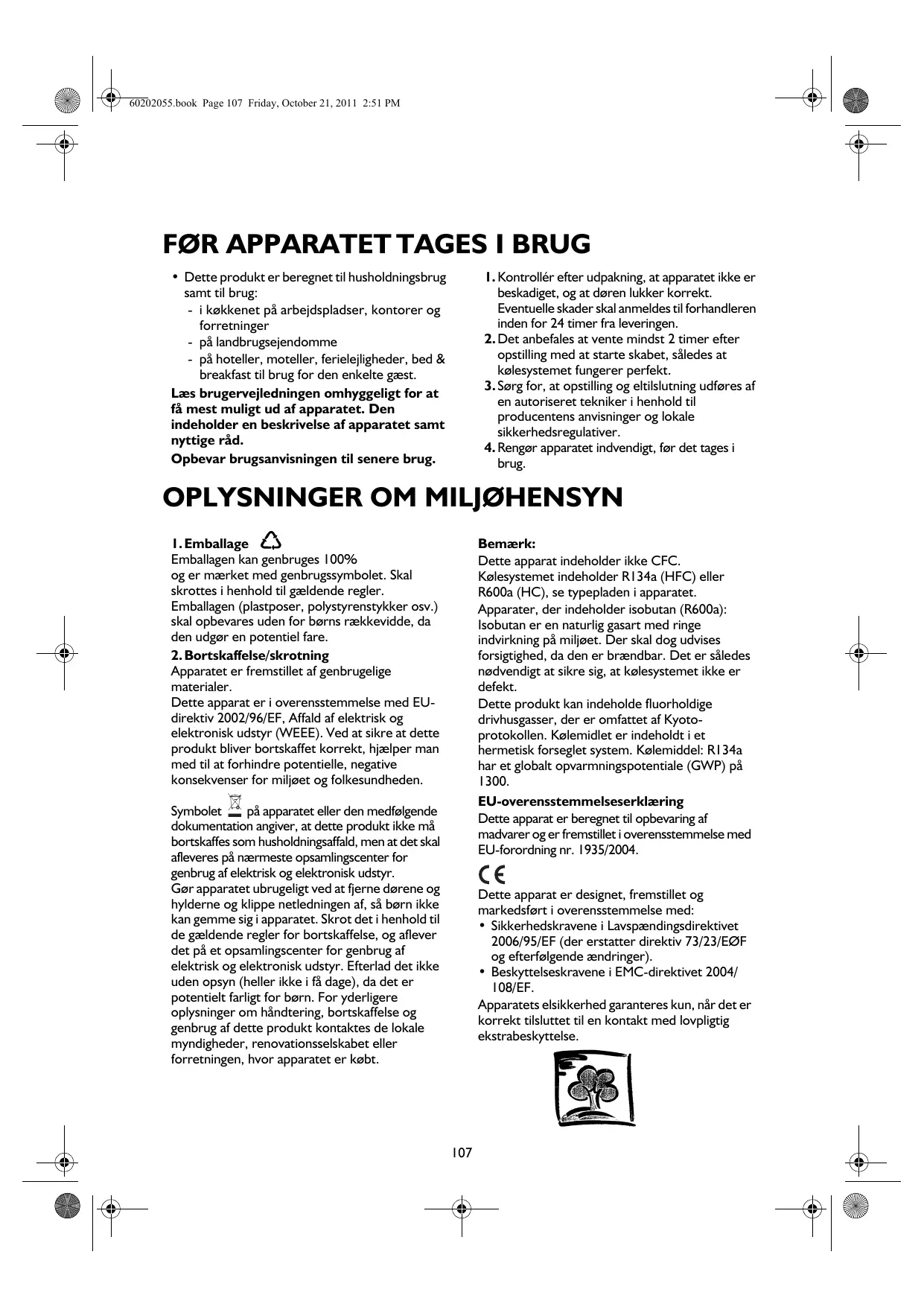 Apparatet er fremstillet af genbrugelige materialer. Dette apparat er i overensstemmelse med EUdirektiv 2002/96/EF, Affald af elektrisk og elektronisk udstyr (WEEE). Ved at sikre at dette produkt bliver bortskaffet korrekt, hjælper man med til at forhindre potentielle, negative konsekvenser for miljøet og folkesundheden. Bemærk: Dette apparat indeholder ikke CFC. Kølesystemet indeholder R134a (HFC) eller R600a (HC), se typepladen i apparatet. Apparater, der indeholder isobutan (R600a): Isobutan er en naturlig gasart med ringe indvirkning på miljøet. Der skal dog udvises forsigtighed, da den er brændbar. Det er således nødvendigt at sikre sig, at kølesystemet ikke er defekt. Dette produkt kan indeholde fluorholdige drivhusgasser, der er omfattet af Kyotoprotokollen. Kølemidlet er indeholdt i et hermetisk forseglet system. Kølemiddel: R134a har et globalt opvarmningspotentiale (GWP) på EU-overensstemmelseserklæring Dette apparat er beregnet til opbevaring af madvarer og er fremstillet i overensstemmelse med EU-forordning nr. 1935/2004. Symbolet på apparatet eller den medfølgende dokumentation angiver, at dette produkt ikke må bortskaffes som husholdningsaffald, men at det skal afleveres på nærmeste opsamlingscenter for genbrug af elektrisk og elektronisk udstyr. Gør apparatet ubrugeligt ved at fjerne dørene og hylderne og klippe netledningen af, så børn ikke kan gemme sig i apparatet. Skrot det i henhold til de gældende regler for bortskaffelse, og aflever det på et opsamlingscenter for genbrug af elektrisk og elektronisk udstyr. Efterlad det ikke uden opsyn (heller ikke i få dage), da det er potentielt farligt for børn. For yderligere oplysninger om håndtering, bortskaffelse og genbrug af dette produkt kontaktes de lokale myndigheder, renovationsselskabet eller forretningen, hvor apparatet er købt. Dette apparat er designet, fremstillet og markedsført i overensstemmelse med: