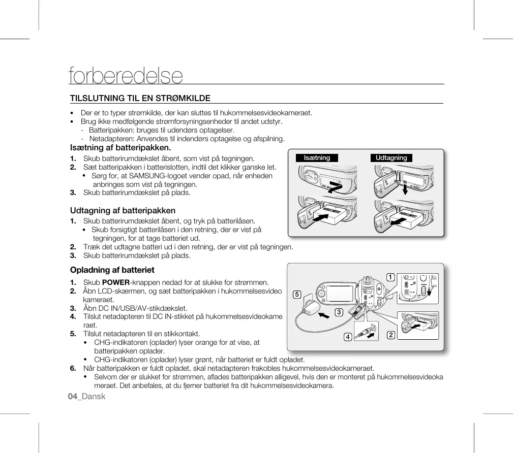 Der er to typer strømkilde, der kan sluttes til hukommelsesvideokameraet. Brug ikke medfølgende strømforsyningsenheder til andet udstyr. - Batteripakken: bruges til udendørs optagelser. - Netadapteren: Anvendes til indendørs optagelse og afspilning. Isætning af batteripakken.