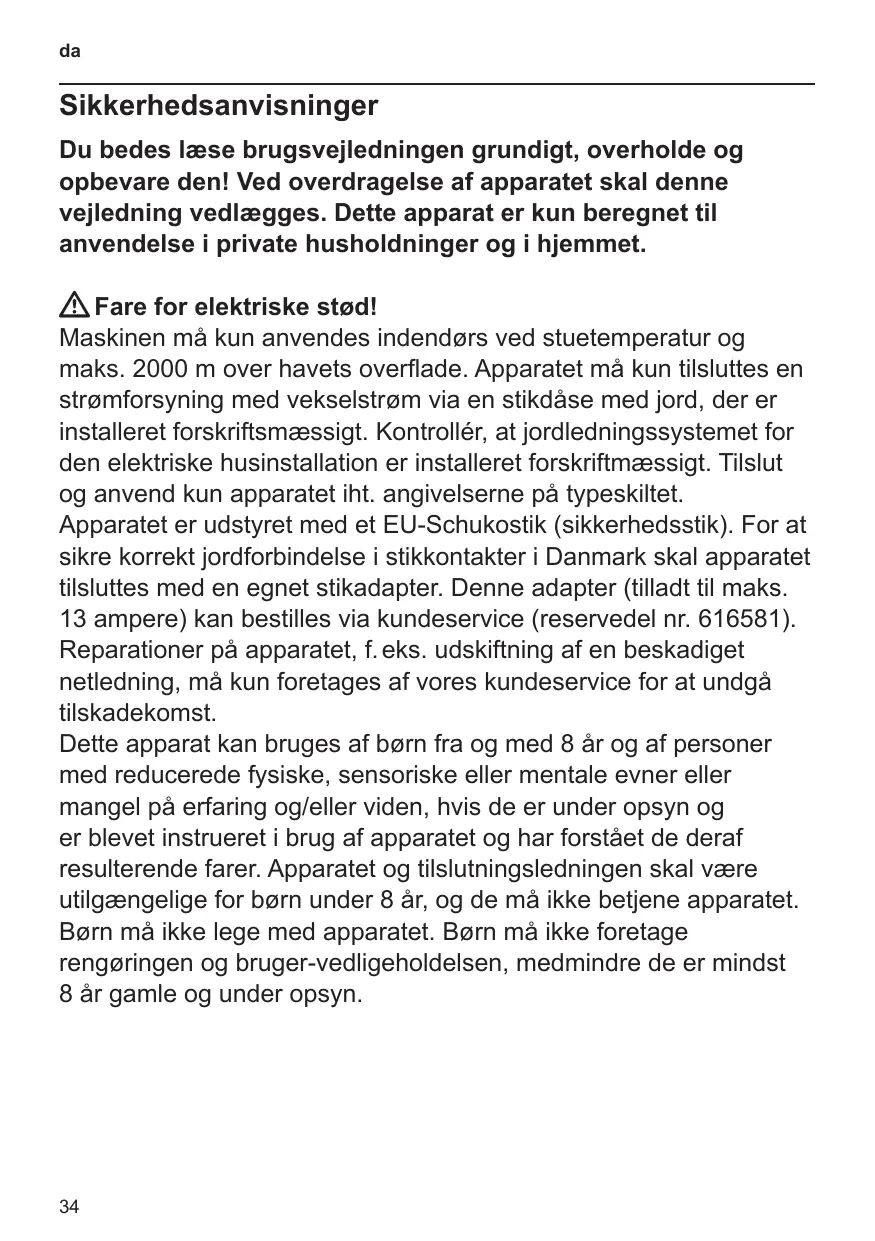 Sikkerhedsanvisninger Du bedes læse brugsvejledningen grundigt, overholde og opbevare den! Ved overdragelse af apparatet skal denne vejledning vedlægges. Dette apparat er kun beregnet til anvendelse i private husholdninger og i hjemmet. W Fare for elektriske stød! Maskinen må kun anvendes indendørs ved stuetemperatur og maks. 2000 m over havets overflade. Apparatet må kun tilsluttes en strømforsyning med vekselstrøm via en stikdåse med jord, der er installeret forskriftsmæssigt. Kontrollér, at jordledningssystemet for den elektriske husinstallation er installeret forskriftmæssigt. Tilslut og anvend kun apparatet iht. angivelserne på typeskiltet. Apparatet er udstyret med et EUSchukostik (sikkerhedsstik). For at sikre korrekt jordforbindelse i stikkontakter i Danmark skal apparatet tilsluttes med en egnet stikadapter. Denne adapter (tilladt til maks. 13 ampere) kan bestilles via kundeservice (reservedel nr. 616581). Reparationer på apparatet, f. eks. udskiftning af en beskadiget netledning, må kun foretages af vores kundeservice for at undgå tilskadekomst. Dette apparat kan bruges af børn fra og med 8 år og af personer med reducerede fysiske, sensoriske eller mentale evner eller mangel på erfaring og/eller viden, hvis de er under opsyn og er blevet instrueret i brug af apparatet og har forstået de deraf resulterende farer. Apparatet og tilslutningsledningen skal være utilgængelige for børn under 8 år, og de må ikke betjene apparatet. Børn må ikke lege med apparatet. Børn må ikke foretage rengøringen og brugervedligeholdelsen, medmindre de er mindst 8 år gamle og under opsyn.