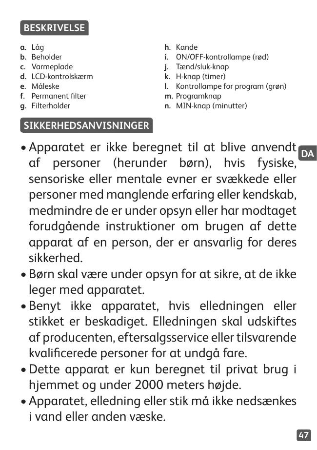 únicamente el asa de la jarra de cristal durante la fase de calentamiento y hasta que se enfríe. • Los niños menores de 8 años podrán utilizar el aparato siempre bajo supervisión, si han recibido instrucciones sobre el uso del aparato