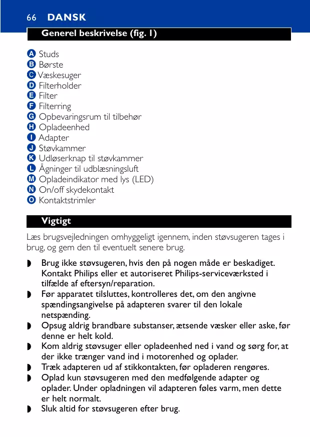 A Studs B Børste C Væskesuger D Filterholder E Filter F Filterring G Opbevaringsrum til tilbehør H Opladeenhed I Adapter J Støvkammer K Udløserknap til støvkammer L Ågninger til udblæsningsluft M Opladeindikator med lys (LED) N On/off skydekontakt O Kontaktstrimler Vigtigt Læs brugsvejledningen omhyggeligt igennem, inden støvsugeren tages i brug, og gem den til eventuelt senere brug. ◗ ◗ ◗ ◗ ◗ ◗ ◗