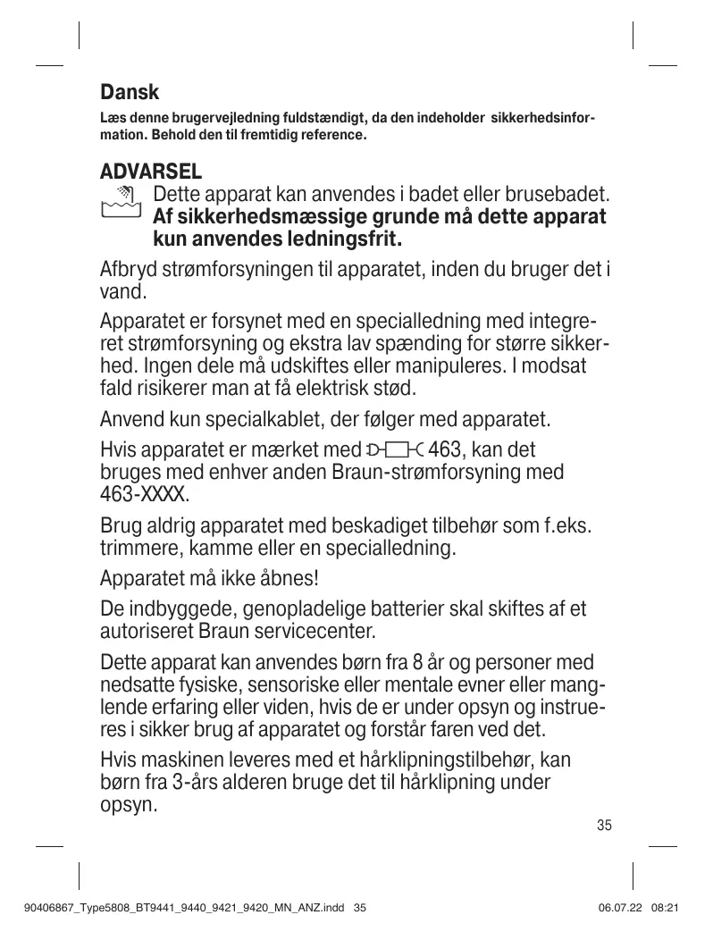 Hvis apparatet er mærket med D-□C 463, kan det bruges med enhver,anden Braun-strømforsyning med 463-XXXX.