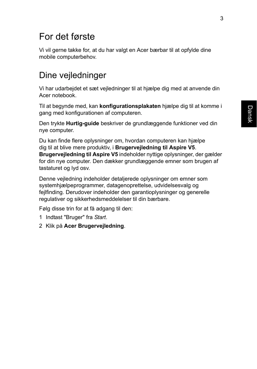 For det første Vi vil gerne takke for, at du har valgt en Acer bærbar til at opfylde dine mobile computerbehov. Dine vejledninger Vi har udarbejdet et sæt vejledninger til at hjælpe dig med at anvende din Acer notebook. Den trykte Hurtig-guide beskriver de grundlæggende funktioner ved din nye computer. Du kan finde flere oplysninger om, hvordan computeren kan hjælpe dig til at blive mere produktiv, i Brugervejledning til Aspire V5. Brugervejledning til Aspire V5 indeholder nyttige oplysninger, der gælder for din nye computer. Den dækker grundlæggende emner som brugen af tastaturet og lyd osv. Denne vejledning indeholder detaljerede oplysninger om emner som systemhjælpeprogrammer, datagenoprettelse, udvidelsesvalg og fejlfinding. Derudover indeholder den garantioplysninger og generelle regulativer og sikkerhedsmeddelelser til din bærbare. Følg disse trin for at få adgang til den: 1 Indtast "Bruger" fra Start. 2 Klik på Acer Brugervejledning. Dansk Dansk Til at begynde med, kan konfigurationsplakaten hjælpe dig til at komme i gang med konfigurationen af computeren.
