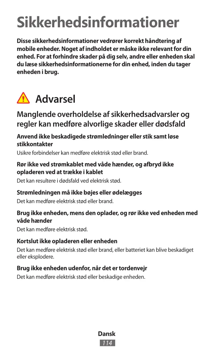 Sikkerhedsinformationer Disse sikkerhedsinformationer vedrører korrekt håndtering af mobile enheder. Noget af indholdet er måske ikke relevant for din enhed. For at forhindre skader på dig selv, andre eller enheden skal du læse sikkerhedsinformationerne for din enhed, inden du tager enheden i brug.