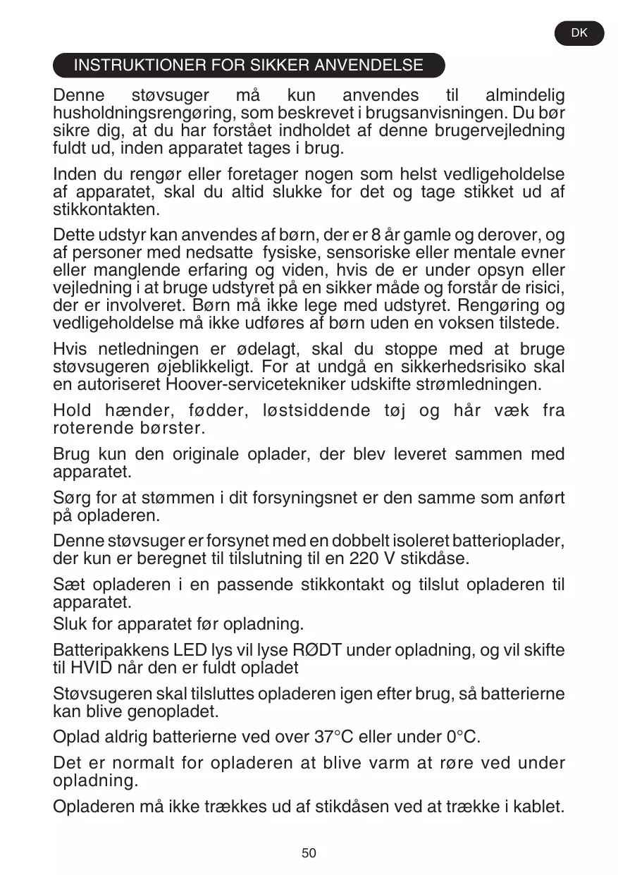 Le nettoyage et l’entretien ne devraient pas être effectués par des enfants sans supervision. Si le cordon d’alimentation est endommagé, arrêtez immédiatement d’utiliser l’appareil. Pour éviter les risques d’accident, un réparateur Hoover agréé doit remplacer le cordon d’alimentation. Maintenez les mains, pieds, vêtements et cheveux à distance des brosses rotatives. Utilisez uniquement le chargeur d’origine qui vous a été fourni avec l’appareil. Vérifiez que la tension de l’alimentation est la même que celle indiquée sur le chargeur. Cet appreil Hoover est fourni avec un chargeur de batterie doublement isolé qui n’est adapté qu’à une prise de 230 V (240 V Grande-Bretagne). Branchez le chargeur dans une prise adaptée et connectez la prise jack du chargeur dans l’appareil. Éteignez l’appareil avant de le charger. Le voyant LED du bloc batterie s’illumine en ROUGE lors de la charge et deviendra BLANC lorsque l’appareil est entièrement chargé. Rebranchez l’appareil au chargeur après l’utilisation pour recharger les batteries. Ne rechargez jamais les batteries dans des températures de plus de 37°C ou en-dessous de 0°C. Il est normal pour le chargeur de devenir chaud au toucher lorsqu’il est en train de charger. Ne pas débrancher en tirant sur le cordon d’alimentation. Débranchez le chargeur en cas d’absence prolongée (vacances, etc.). Rechargez l’appareil de nouveau avant de l’utiliser car les 8