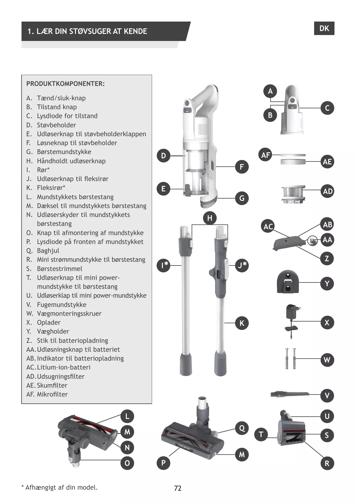 F. Bouton d’éjection du bac à poussière G. Brosse meuble H. Bouton de déverrouillage de l’aspirateur à main I. Tube* J. Bouton de déverrouillage du tube flexible K. Tube flexible* L. Rouleau de la brosse M. Couvercle de la brosse N. Coulisseau de déverrouillage du rouleau de la brosse O. Bouton pour détacher la brosse P. Lumière LED frontale de la brosse Q. Brosse R. Rouleau de la mini turbo brosse animaux S. Bande douce T. Bouton de déverrouillage du rouleau de la mini turbo brosse animaux U. Bouton de déverrouillage de la mini turbo brosse animaux V. Suceur plat W. Vis de montage mural X. Chargeur Y. Base murale Z. Prise de charge de la batterie AA. Bouton de déverrouillage de la batterie AB. Indicateur de charge de la batterie AC. Batterie aux ions lithium AD. Filtre de sortie de l’air AE. Filtre en mousse AF. Micro-filtre