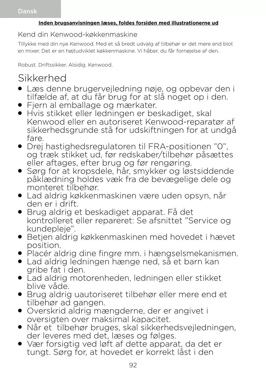 Lisez et conservez soigneusement ces instructions pour pouvoir vous y référer ultérieurement. O Retirez tous les éléments d’emballage et les étiquettes. O Si le cordon ou la prise sont endommagés, il faut les faire remplacer, pour des raisons de sécurité, par Kenwood ou un réparateur agréé par Kenwood pour éviter tout accident. O Mettez la commande de vitesse sur la position “ O “ OFF (Arrêt) et débranchez avant d’installer ou de retirer des ustensiles / accessoires, après utilisation et avant toute opération de nettoyage. O N’approchez pas des parties de votre corps, cheveux, bijoux ou vêtements amples des parties en mouvement et des accessoires installés. O Ne laissez jamais le robot pâtissier multifonction sans surveillance lorsqu’il fonctionne. O N’utilisez jamais un appareil endommagé. Faites-le vérifier ou réparer : reportez-vous à la rubrique “ Service après-vente “. O Ne faites jamais fonctionner votre robot pâtissier multifonction avec la tête en position levée. O Ne mettez pas les doigts dans le mécanisme de charnière. O Ne laissez jamais le cordon pendre de telle façon qu’un enfant puisse s’en saisir. O Veillez à ne jamais mouiller le bloc moteur, le cordon d’alimentation ou la prise. O N’utilisez jamais un accessoire non agréé ou plus d’un seul accessoire à la fois. O Ne dépassez jamais les quantités stipulées dans le tableau indiquant les quantités maximales. O