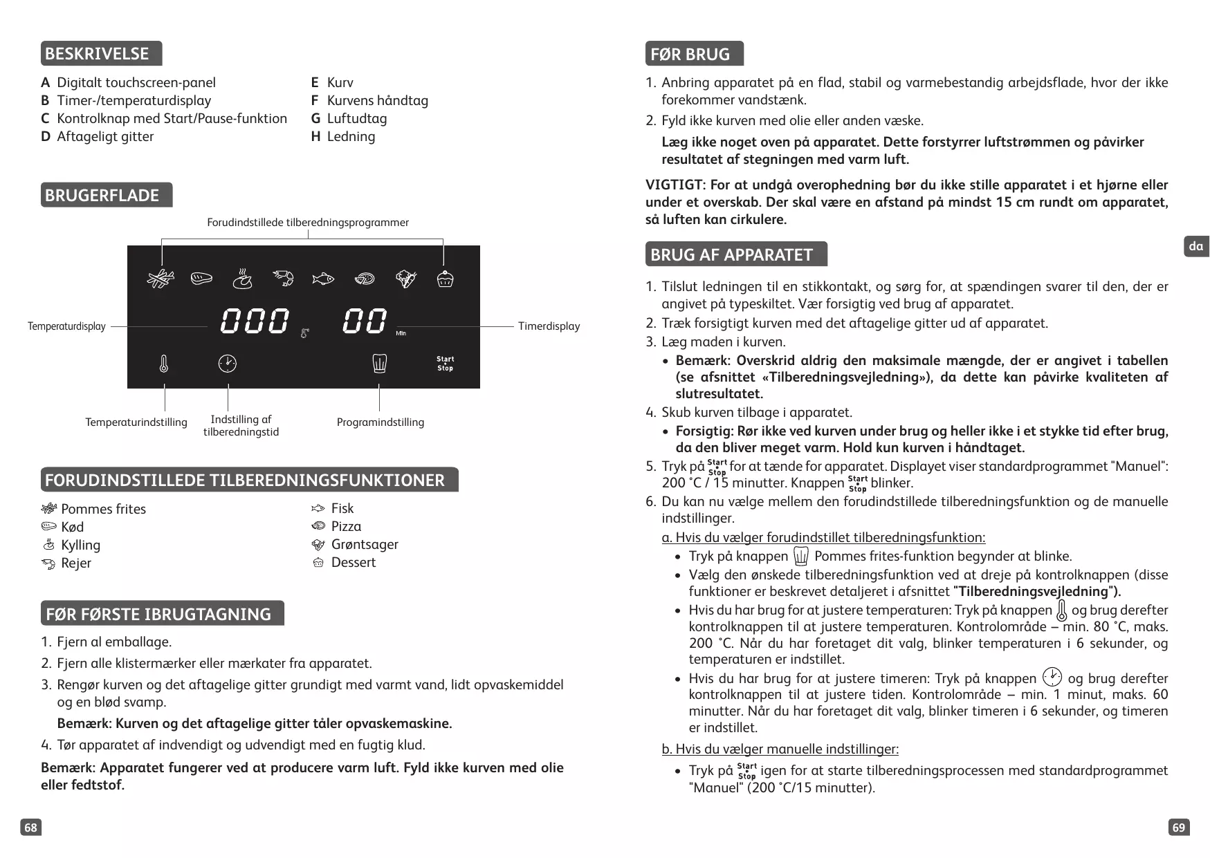 2. Retirez délicatement le tiroir de cuisson avec sa grille amovible de l’appareil. 3. Placez les aliments dans le tiroir de cuisson. • Remarque : ne dépassez jamais la quantité maximale indiquée dans le tableau (voir la section « Guide de cuisson »), car cela pourrait altérer la qualité du résultat final. 4. Replacez le tiroir de cuisson dans l’appareil. • Attention : ne touchez pas le tiroir de cuisson pendant l’utilisation et pendant un certain temps après utilisation, car il devient très chaud. Tenez le tiroir de cuisson par la poignée uniquement. 5. Appuyez sur pour allumer l’appareil. L’écran affiche le programme « Manuel » par défaut : 200°C / 15 minutes. Le bouton clignote. 6. Vous pouvez maintenant choisir entre le mode de cuisson prédéfini et le réglage manuel. a. Si vous choisissez le mode de cuisson prédéfini : • Appuyez sur le bouton Le mode Frites se met à clignoter. • Sélectionnez le mode de cuisson souhaité en tournant le bouton de contrôle (ces modes sont décrits en détail dans la section « Guide de cuisson »). • Si vous devez régler la température : appuyez sur le bouton puis utilisez le bouton de contrôle pour régler la température. Plage de contrôle : min. 80°C, max. 200°C. Une fois la sélection effectuée, la température clignote pendant 6 secondes avant d’être réglée. • S i vous devez régler le minuteur : appuyez sur le bouton puis utilisez le bouton de contrôle pour régler le temps. Plage de contrôle : min. 1 minute, max. 60 minutes. Une fois votre sélection effectuée, le minuteur clignote pendant 6 secondes avant d’être réglé. • Si vous devez régler la température : appuyez sur le bouton puis utilisez le bouton de contrôle pour régler la température. Plage de contrôle : min. 80°C, max. 200°C. Une fois la sélection effectuée, la température clignote pendant 6 secondes avant d’être réglée. • Si vous devez régler le minuteur : appuyez sur le bouton puis utilisez le bouton de contrôle pour régler le temps. Plage de contrôle : min. 1 minute, max. 60 minutes. Une fois votre sélection effectuée, le minuteur clignote pendant 6 secondes avant d’être réglé. 7. Pour revenir au programme « Manuel » par défaut, appuyez simplement de nouveau sur le bouton . 8. Validez le mode de cuisson en appuyant sur le bouton Cela lance votre cuisson. La cuisson se met en route. Le temps de cuisson restant s’affiche à l’écran. 9. Certains aliments nécessiteront d’être brassés en milieu de cuisson pour un résultat de cuisson optimal (voir la section « Guide de cuisson »). Pour brasser les aliments, appuyez sur le centre du bouton de contrôle ou sur le bouton pour interrompre la cuisson. Retirez le tiroir de cuisson hors de l’appareil par la poignée et secouez-le. Replacez le tiroir de cuisson dans l’appareil, puis appuyez de nouveau sur le centre du bouton de contrôle ou sur le bouton pour reprendre la cuisson. • Astuce : vous pouvez régler le minuteur sur la moitié du temps de cuisson. Lorsque le minuteur retentit, brassez les ingrédients. Réglez ensuite à nouveau le minuteur sur le temps de cuisson restant. • Remarque : lorsque le tiroir de cuisson est retiré, l’appareil passe en mode Pause. Pour que la cuisson reprenne, le tiroir de cuisson doit être replacé dans l’appareil dans les 10 minutes. Si le tiroir de cuisson n’est pas replacé dans l’appareil dans les 10 minutes, le programme, la température et la durée doivent être reconfigurés. • Avertissement : s’il y a beaucoup d’aliments dans le tiroir de cuisson, celui-ci peut être lourd. Lorsque vous secouez le tiroir de cuisson, utilisez vos deux mains et un gant de cuisine pour éviter de vous brûler. 10. Lorsque le minuteur retentit, le temps de cuisson configuré est terminé. Retirez le tiroir de cuisson de l’appareil et posez-le sur une surface résistante à la chaleur. 11. Vérifiez que vos aliments sont prêts. Si vos aliments ne sont pas prêts, replacez simplement le tiroir de cuisson dans l’appareil et réglez le minuteur pour ajouter quelques minutes de cuisson supplémentaires. 12. Lorsque les aliments sont cuits, utilisez une pince non métallique (par exemple, une pince en silicone) pour retirer les aliments du tiroir de cuisson. L’excès d’huile de la nourriture est recueilli dans le fond du tiroir de cuisson. • Attention : ne retournez jamais le tiroir de cuisson, car la grille amovible et l’huile chaude pourraient tomber.