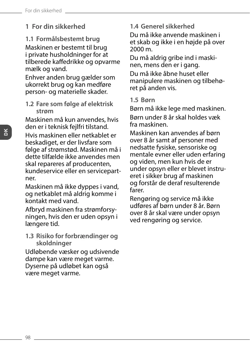 Un appareil et/ou un cordon d’alimentation endommagés présentent des dangers de mort par choc électrique. Il est interdit d’utiliser l’appareil dans ce cas : vous devez le faire réparer par le fabricant, le service après-vente ou un distributeur. Ne pas plonger l’appareil dans l’eau ou éviter que le cordon d’alimentation n’entre en contact avec de l’eau. Débrancher l’appareil s’il reste sans surveillance de manière prolongée. 1.3 Risque de brûlure et d’éclaboussures Les liquides et les vapeurs qui s’échappent peuvent être brûlants. Les buses du bec verseur peuvent elles aussi devenir très chaudes.