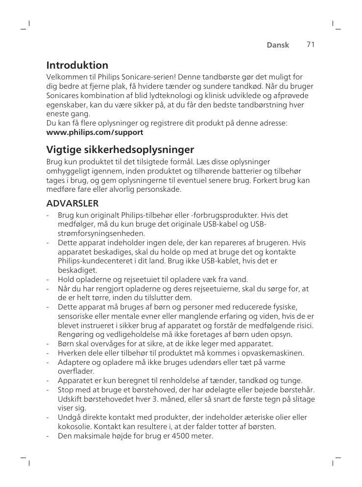 - Consommateurs de votre pays. Si le câble USB est endommagé, cessez de l’utiliser. Évitez tout contact des chargeurs et du coffret de voyage avec de l’eau. Après les avoir nettoyés, assurez-vous que les chargeurs et les coffrets de voyage sont complètement secs avant de les brancher. Cet appareil peut être utilisé par des enfants, des personnes dont les capacités physiques, sensorielles ou intellectuelles sont réduites ou des personnes manquant d'expérience et de connaissances, à condition que ces enfants ou personnes soient sous surveillance ou qu'ils aient reçu des instructions quant à l'utilisation sécurisée de l'appareil et qu'ils aient pris connaissance des dangers encourus. Le nettoyage et l'entretien ne doivent pas être effectués par des enfants sans surveillance. Les enfants doivent être surveillés pour s'assurer qu'ils ne s'amusent pas avec le produit. Ne nettoyez aucune pièce du produit au lave-vaisselle. N’utilisez pas les adaptateurs et chargeurs à l’extérieur ou près de surfaces chauffantes. Cet appareil a été conçu uniquement pour le brossage des dents, des gencives et de la langue.