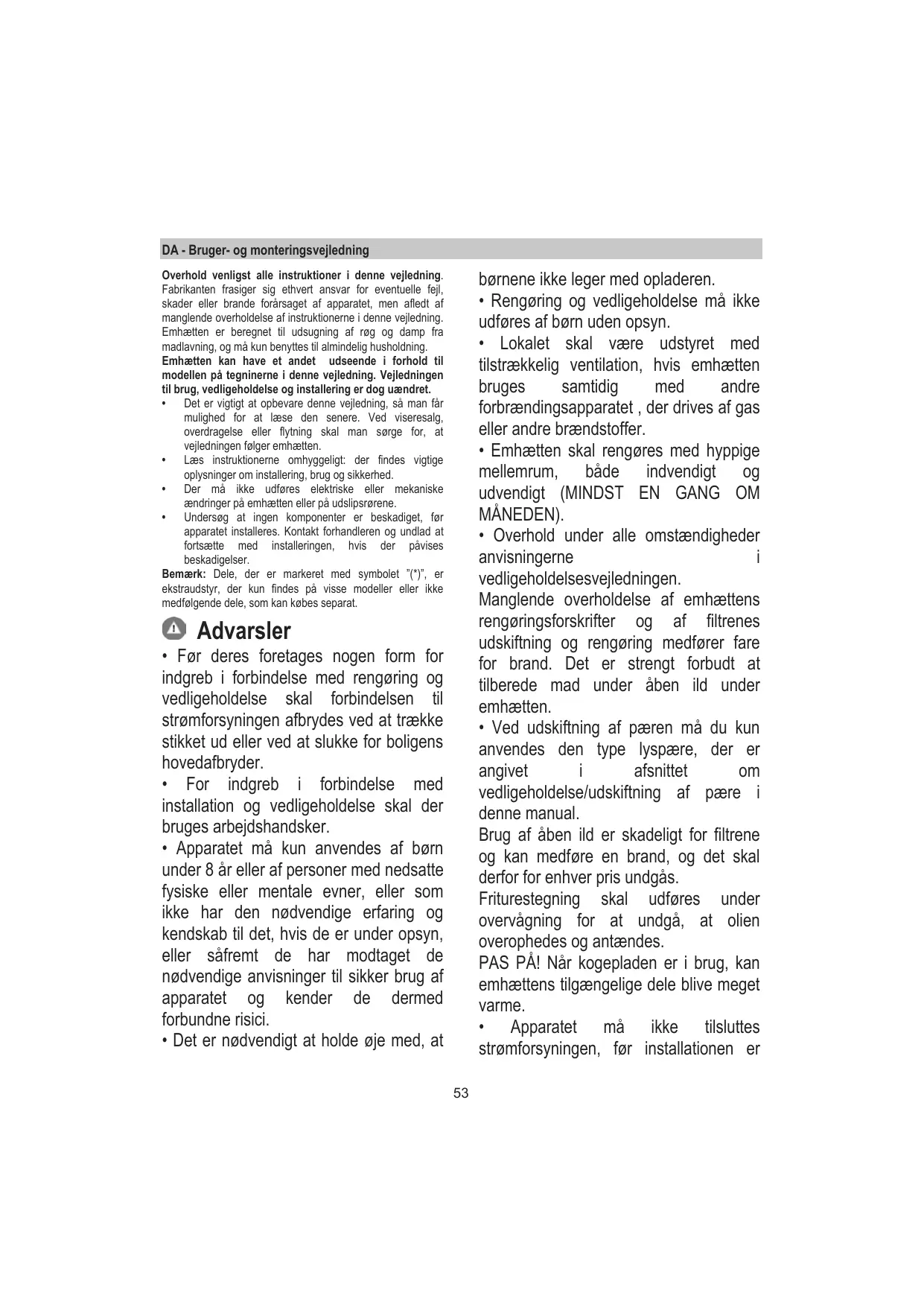 • Para la sustitución de la lámpara sólo utilizar el tipo de lámpara indicado en la sección de mantenimiento/sustitución de este manual. El uso de una llama libre es perjudicial para los filtros y puede provocar incendios, por lo tanto, debe evitarse en cualquier caso. Los fritos debe realizarse con cuidado para evitar que el aceite caliente prenda fuego. ATENCIÓN: Cuando la placa de cocción está funcionando las partes accesibles de la campana pueden calentarse.