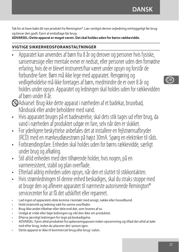 Tenez l’appareil et le câble hors de portée des enfants de moins de 8 ans. L Avertissement : Veillez à ne pas utiliser cet appareil à proximité de baignoires, douches, lavabos ou autres récipients contenant de l’eau. • Lorsque l’appareil est utilisé dans une salle de bains, débranchez-le après usage. La proximité de l’eau présente un danger même lorsque l’appareil est éteint. • Pour une protection supplémentaire, l’installation de courant résiduel (RCD)avec un differentiel residuel nominal ne dépassant pas 30mA est recommandée. Demandez de l’aide à un électricien. • Risque de brûlure. Veillez à maintenir l’appareil hors de portée des jeunes enfants, en particulier lorsque vous utilisez l’appareil et lorsqu’il refroidit. • Placez toujours l’appareil avec son support, le cas échéant, sur une surface plate, stable et résistante à la chaleur. • Ne laissez en aucun cas l’appareil sans surveillance quand il est connecté au réseau électrique. • Si le cordon d’alimentation de cet appareil est endommagé, cessez immédiatement d’utiliser l’appareil et renvoyez-le au service consommateurs Remington agréé le plus proche en vue de sa réparation ou de sa substitution afin d’éviter tout risque.