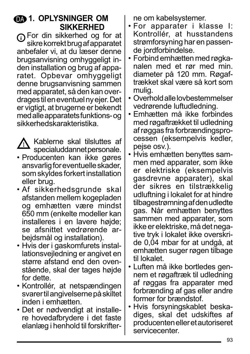 • Pour les appareils de Classe I, s’assurer que l’installation électrique de votre intérieur dispose d’une mise à la terre adéquate. Reliez l’aspirateur du conduit de cheminée avec un tube ayant un diamètre minimum de 120 mm. Le parcours des fumées doit être le plus court possible. Respecter toutes les normes concernant l’évacuation de l’air. Ne reliez pas la hotte aspirante aux conduits de cheminée qui acheminent les fumées de combustion (par ex. de chaudières, de cheminées, etc.). Si vous utilisez l’aspirateur en même temps que des appareils non électriques (par ex. fonctionnant au gaz), veillez à ce que la pièce soit adéquatement ventilée, afin d’empêcher le retour du flux des gaz d’évacuation. Si vous utilisez la hotte de cuisine en même temps que des appareils non alimentés à l’électricité, la pression négative dans la pièce ne doit pas dépasser 0,04 mbar, afin d’éviter que les fumées soient réaspirées dans la pièce où se trouve la hotte. Ne pas évacuer l’air à travers 15