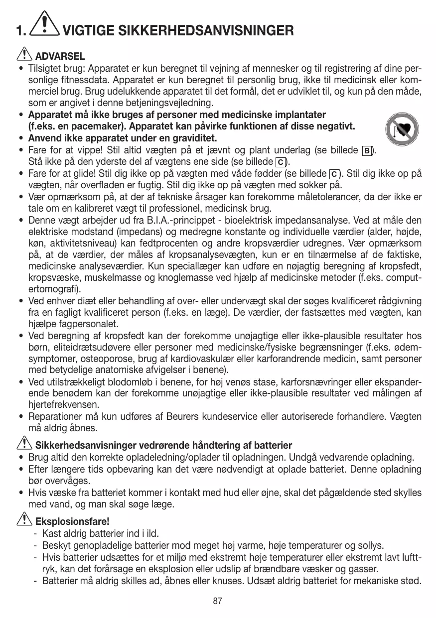 • 1 x appareil • 1 x câble de recharge USB-C • 1 x mode d’emploi • 1 x guide de démarrage rapide (par ex. stimulateur cardiaque). Sinon, leur fonctionnement pourrait être altéré. • N’utilisez pas l’appareil pendant une grossesse. • Risque de basculement ! Ne posez jamais le pèse-personne sur une surface non plane (voir figure B ). Ne vous tenez pas sur le bord extérieur du pèse-personne (voir figure C ). • Risque de glissade ! Ne montez pas sur le pèse-personne les pieds mouillés (voir figure C ). Ne montez pas sur le pèse-personne si la surface est humide. Ne montez pas sur le pèse-personne avec des chaussettes. • Notez que des tolérances de mesure techniques sont possibles, car il ne s’agit pas d’un pèse-personne calibré destiné à un usage professionnel ou médical. • Ce pèse-personne fonctionne selon le principe de la B.I.A., l’analyse bioélectrique de l’impédance. La mesure de la résistance électrique (impédance) ainsi que la prise en compte de constantes ou de données individuelles (âge, taille, sexe, activité physique) permettent de définir le taux de graisse corporelle et d’autres paramètres physiques. Notez que les valeurs déterminées par le pèse-personne impédancemètre ne représentent que des approximations par rapport aux analyses physiques effectives d’ordre médical. Seul un spécialiste équipé de matériel médical (par exemple un tomodensitomètre) est en mesure de déterminer précisément la graisse corporelle, l’eau corporelle, la masse musculaire et la masse osseuse. • Pour chaque régime ou traitement de surpoids ou de sous-poids, un conseil qualifié doit être prodigué par du personnel spécialisé (p. ex. un médecin). Les valeurs obtenues à l’aide du pèse-personne peuvent être consultées par le personnel qualifié. • En ce qui concerne les enfants, les sportifs de haut niveau ou les personnes présentant des limitations médicales/corporelles (p. ex. symptômes d’œdème, ostéoporose, prise de médicaments pour le traitement des maladies cardio-vasculaires, personnes présentant des écarts anatomiques importants au niveau des jambes), des résultats imprécis ou non plausibles peuvent apparaître lors de la détermination de la graisse corporelle. • En cas de circulation sanguine insuffisante dans les jambes, de stase veineuse trop élevée, de vasoconstriction ou d’œdème de jambe étendu, des résultats imprécis ou non plausibles peuvent apparaître lors de la détermination de la fréquence cardiaque. • Seul le service client Beurer ou un opérateur autorisé peut procéder à une réparation. N’ouvrez jamais le pèse-personne vous-même. Consignes de sécurité relatives aux batteries • Toujours utiliser le bon câble/chargeur pour le chargement. Éviter un chargement permanent. • Après un stockage prolongé, il peut s’avérer nécessaire de charger la batterie. Ce processus de chargement doit être observé. • Si du liquide de la cellule de batterie entre en contact avec la peau ou les yeux, rincez la zone touchée avec de l’eau et consultez un médecin. Risque d’explosion ! - Ne jetez pas les batteries dans le feu. - Protégez les batteries d’une chaleur excessive et des rayons du soleil. - L’exposition des batteries à des températures extrêmement élevées ou à une pression d’air extrêmement basse peut entraîner une explosion ou une fuite de liquides et de gaz inflammables. - Ne démontez, n’ouvrez ou ne cassez pas les batteries. N’exposez jamais la batterie à des chocs mécaniques. 24