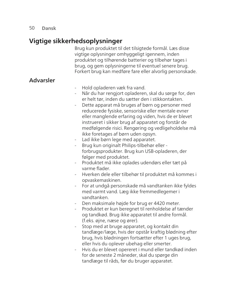 Cet appareil peut être utilisé par des enfants, des personnes dont les capacités physiques, sensorielles ou intellectuelles sont réduites ou des personnes manquant d'expérience et de connaissances, à condition que ces enfants ou personnes soient sous surveillance ou qu'ils aient reçu des instructions quant à l'utilisation sécurisée de l'appareil et qu'ils aient pris connaissance des dangers encourus. Le nettoyage et l'entretien ne doivent pas être effectués par des enfants sans surveillance. Les enfants ne doivent pas jouer avec l'appareil. Utilisez exclusivement des accessoires ou des consommables Philips d’origine. Utilisez uniquement le chargeur USB fourni avec le produit. Ne chargez pas le produit en extérieur ou à proximité de surfaces chauffantes. Ne nettoyez aucune pièce du produit au lave-vaisselle. Pour éviter les blessures physiques, ne remplissez pas le réservoir d'eau chaude. Ne mettez pas d'objets étrangers dans le réservoir. L'altitude d'utilisation maximale est de 4 420 mètres. Ce produit a été conçu uniquement pour le nettoyage des dents et des gencives. Ne l'utilisez jamais à d'autres fins. (par exemple, pour les yeux, le nez ou les oreilles).
