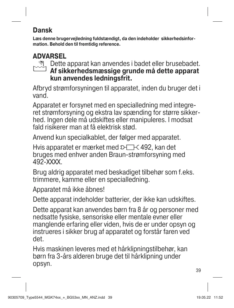 Dansk Læs denne brugervejledning fuldstændigt, da den indeholder sikkerhedsinformation. Behold den til fremtidig reference. ADVARSEL Dette apparat kan anvendes i badet eller brusebadet. Af sikkerhedsmæssige grunde må dette apparat kun anvendes ledningsfrit. Afbryd strømforsyningen til apparatet, inden du bruger det i vand. Apparatet er forsynet med en specialledning med integreret strømforsyning og ekstra lav spænding for større sikkerhed. Ingen dele må udskiftes eller manipuleres. I modsat fald risikerer man at få elektrisk stød. Anvend kun specialkablet, der følger med apparatet. 492, kan det Hvis apparatet er mærket med bruges med enhver anden Braun-strømforsyning med 492-XXXX. Brug aldrig apparatet med beskadiget tilbehør som f.eks. trimmere, kamme eller en specialledning. Apparatet må ikke åbnes! Dette apparat indeholder batterier, der ikke kan udskiftes. Dette apparat kan anvendes børn fra 8 år og personer med nedsatte fysiske, sensoriske eller mentale evner eller manglende erfaring eller viden, hvis de er under opsyn og instrueres i sikker brug af apparatet og forstår faren ved det. Hvis maskinen leveres med et hårklipningstilbehør, kan børn fra 3-års alderen bruge det til hårklipning under opsyn.