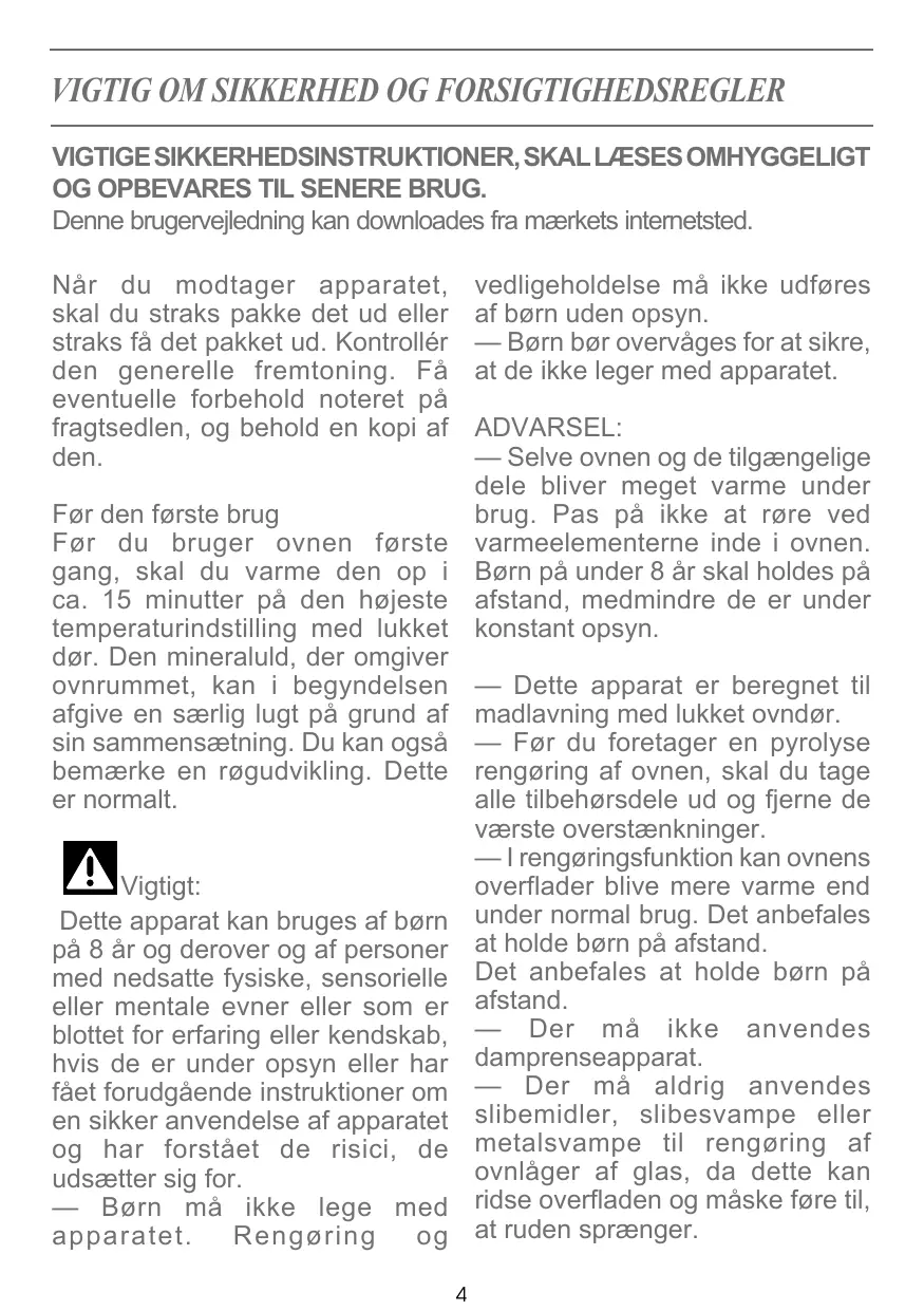 • L’appareil et ses parties accessibles deviennent chaudes au cours de l’utilisation. Faire attention à ne pas toucher les éléments chauffants situés à l’intérieur du four. Les enfants de moins de 8 ans doivent être tenus à l’écart à moins qu’ils ne soient surveillés en permanence. • Cet appareil est conçu pour faire des cuissons porte fermée. • Avant de procéder à un nettoyage pyrolyse de votre four, retirez tous les accessoires et enlevez les éclaboussures importantes. • Dans la fonction de nettoyage, les surfaces peuvent devenir plus chaudes qu’en usage normal. Il 5