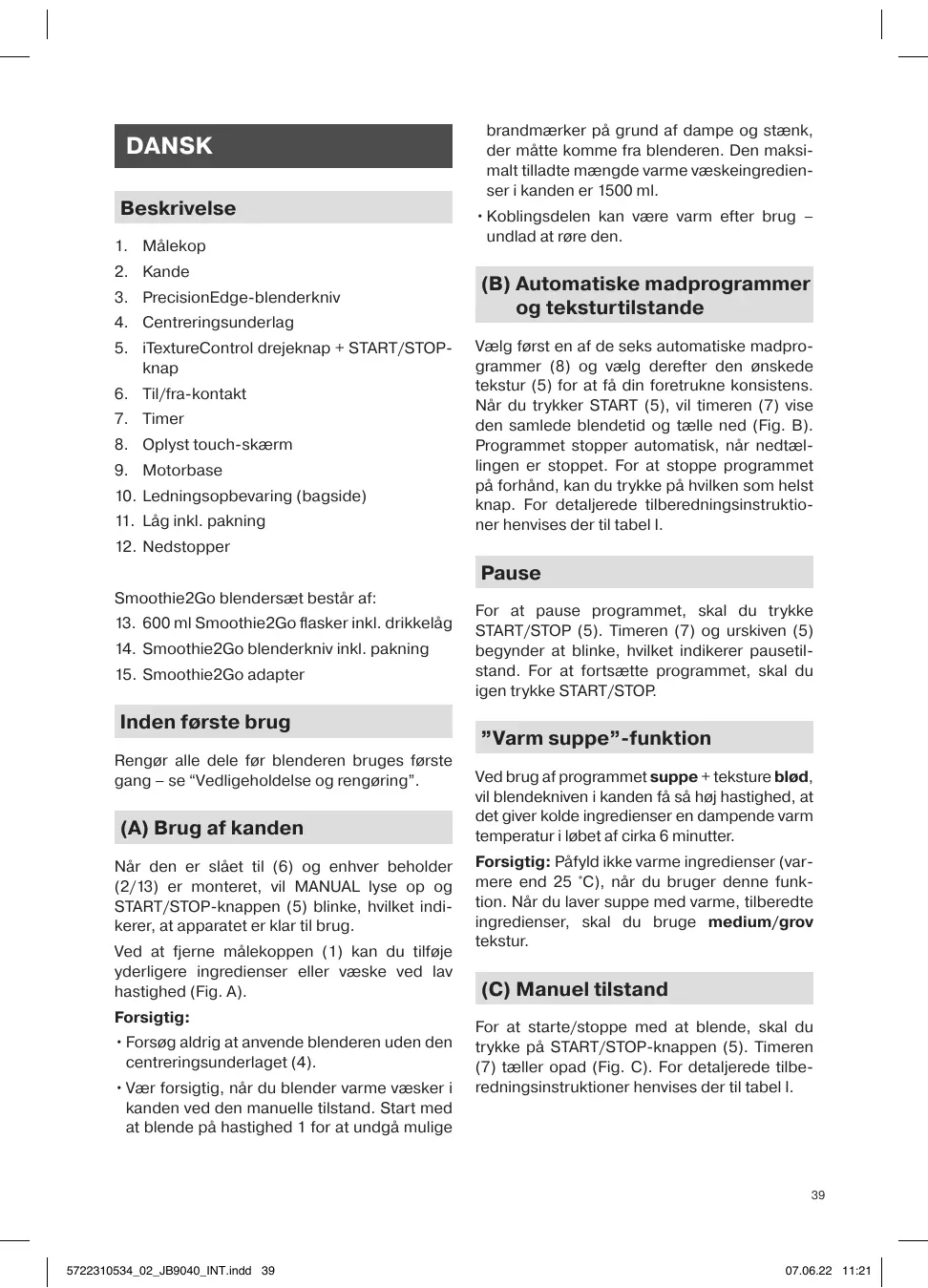 Automatiques et Modes de Texture Tout d‘abord, sélectionnez l’un des six programmes alimentaires automatiques (8) puis sélectionnez la texture (5) de votre choix pour obtenir votre consistance préférée. Après avoir appuyé sur START (5), le minuteur (7) affiche le temps de mixage total et effectue un compte à rebours (Fig. B). Le programme s‘arrête automatiquement à la fin du compte à rebours. Pour arrêter le programme avant la fin, appuyez sur n’importe quel bouton. Pour les instructions de fonctionnement détaillées voir le tableau I.