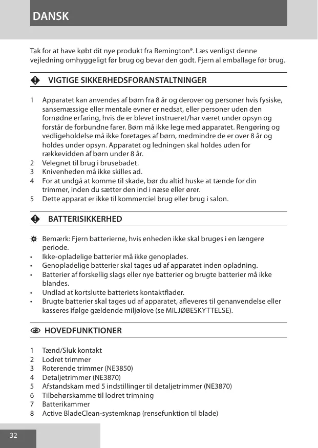Apparatet kan anvendes af børn fra 8 år og derover og personer hvis fysiske, sansemæssige eller mentale evner er nedsat, eller personer uden den fornødne erfaring, hvis de er blevet instrueret/har været under opsyn og forstår de forbundne farer. Børn må ikke lege med apparatet. Rengøring og vedligeholdelse må ikke foretages af børn, medmindre de er over 8 år og holdes under opsyn. Apparatet og ledningen skal holdes uden for rækkevidden af børn under 8 år. Velegnet til brug i brusebadet. Knivenheden må ikke skilles ad. For at undgå at komme til skade, bør du altid huske at tænde for din trimmer, inden du sætter den ind i næse eller ører. Dette apparat er ikke til kommerciel brug eller brug i salon.