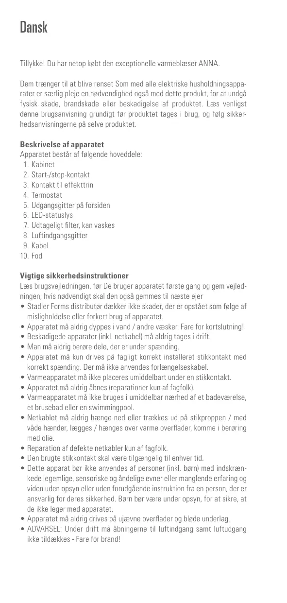 Dansk Tillykke! Du har netop købt den exceptionelle varmeblæser ANNA. Dem trænger til at blive renset Som med alle elektriske husholdningsapparater er særlig pleje en nødvendighed også med dette produkt, for at undgå fysisk skade, brandskade eller beskadigelse af produktet. Læs venligst denne brugsanvisning grundigt før produktet tages i brug, og følg sikkerhedsanvisningerne på selve produktet. Beskrivelse af apparatet Apparatet består af følgende hoveddele: 1. Kabinet 2. Start-/stop-kontakt 3. Kontakt til effekttrin 4. Termostat 5. Udgangsgitter på forsiden 6. LED-statuslys 7. Udtageligt filter, kan vaskes 8. Luftindgangsgitter 9. Kabel 10. Fod Vigtige sikkerhedsinstruktioner Læs brugsvejledningen, før De bruger apparatet første gang og gem vejledningen; hvis nødvendigt skal den også gemmes til næste ejer •• Stadler Forms distributør dækker ikke skader, der er opstået som følge af misligholdelse eller forkert brug af apparatet. •• Apparatet må aldrig dyppes i vand / andre væsker. Fare for kortslutning! •• Beskadigede apparater (inkl. netkabel) må aldrig tages i drift. •• Man må aldrig berøre dele, der er under spænding. •• Apparatet må kun drives på fagligt korrekt installeret stikkontakt med korrekt spænding. Der må ikke anvendes forlængelseskabel. •• Varmeapparatet må ikke placeres umiddelbart under en stikkontakt. •• Apparatet må aldrig åbnes (reparationer kun af fagfolk). •• Varmeapparatet må ikke bruges i umiddelbar nærhed af et badeværelse, et brusebad eller en swimmingpool. •• Netkablet må aldrig hænge ned eller trækkes ud på stikproppen / med våde hænder, lægges / hænges over varme overflader, komme i berøring med olie. •• Reparation af defekte netkabler kun af fagfolk. •• Den brugte stikkontakt skal være tilgængelig til enhver tid. •• Dette apparat bør ikke anvendes af personer (inkl. børn) med indskrænkede legemlige, sensoriske og åndelige evner eller manglende erfaring og viden uden opsyn eller uden forudgående instruktion fra en person, der er ansvarlig for deres sikkerhed. Børn bør være under opsyn, for at sikre, at de ikke leger med apparatet. •• Apparatet må aldrig drives på ujævne overflader og bløde underlag. •• ADVARSEL: Under drift må åbningerne til luftindgang samt luftudgang ikke tildækkes - Fare for brand!