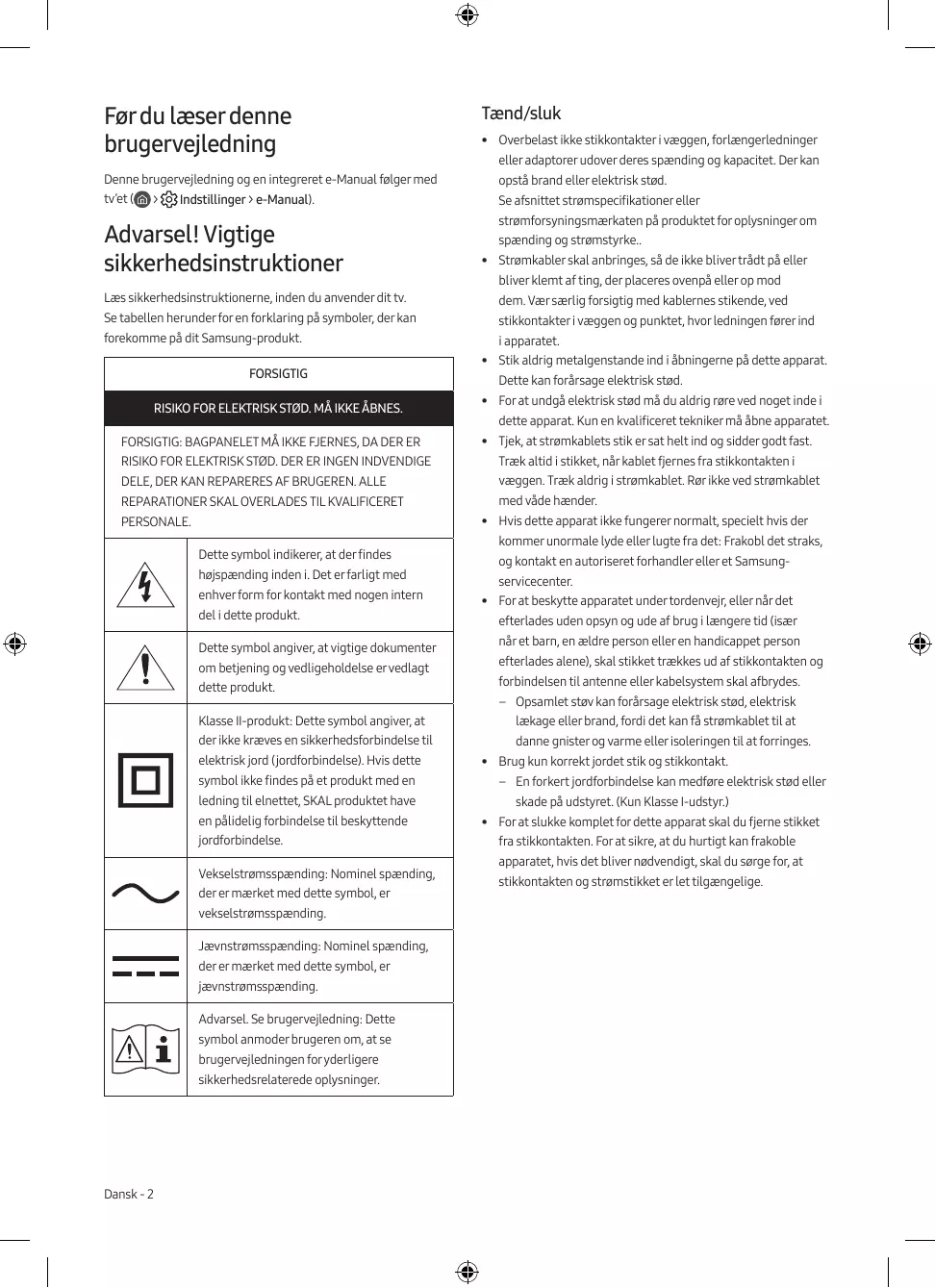 - • Strømkabler skal anbringes, så de ikke bliver trådt på eller bliver klemt af ting, der placeres ovenpå eller op mod Læs sikkerhedsinstruktionerne, inden du anvender dit tv. dem. Vær særlig forsigtig med kablernes stikende, ved Se tabellen herunder for en forklaring på symboler, der kan stikkontakter i væggen og punktet, hvor ledningen fører ind forekomme på dit Samsung-produkt. FORSIGTIG RISIKO FOR ELEKTRISK STØD. MÅ IKKE ÅBNES. FORSIGTIG: BAGPANELET MÅ IKKE FJERNES, DA DER ER i apparatet.