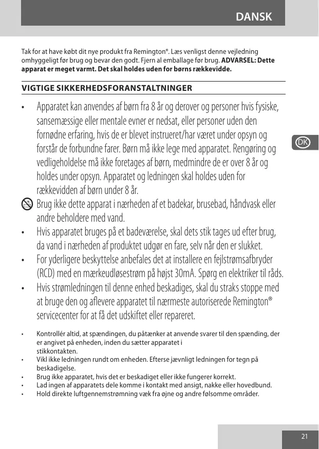 • Lorsque l’appareil est utilisé dans une salle de bains, débranchez-le après usage. La proximité de l’eau présente un danger même lorsque l’appareil est éteint. • Pour une protection supplémentaire, l’installation de courant résiduel (RCD) avec un differentiel residuel nominal ne dépassant pas 30mA est recommandée. Demandez de l’aide à un électricien. • Si le cordon d’alimentation de cet appareil est endommagé, cessez immédiatement d’utiliser l’appareil et renvoyez-le au service consommateurs Remington agréé le plus proche en vue de sa réparation ou de sa substitution afin d’éviter tout risque. • •