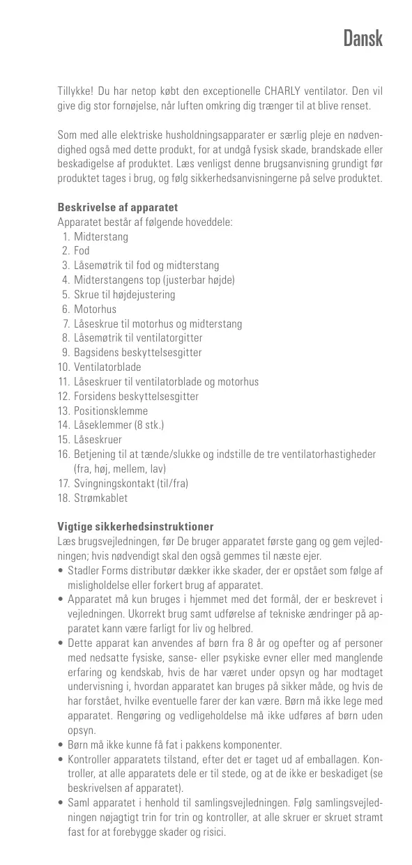 < 56 dB(A) CE / AEEA / RoHS / EAC De inhoud van deze gebruiksaanwijzing kan zonder voorafgaand bericht worden gewijzigd Dansk Tillykke! Du har netop købt den exceptionelle CHARLY ventilator. Den vil give dig stor fornøjelse, når luften omkring dig trænger til at blive renset. Som med alle elektriske husholdningsapparater er særlig pleje en nødvendighed også med dette produkt, for at undgå fysisk skade, brandskade eller beskadigelse af produktet. Læs venligst denne brugsanvisning grundigt før produktet tages i brug, og følg sikkerhedsanvisningerne på selve produktet. Beskrivelse af apparatet Apparatet består af følgende hoveddele: