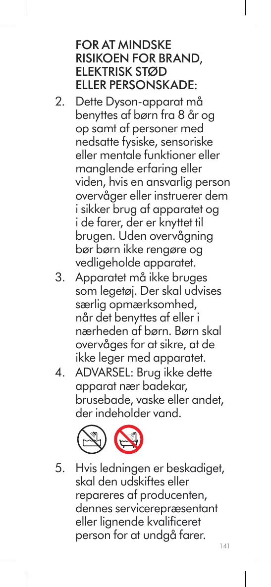 L’utilisation d’une rallonge est déconseillée. 12. N’étirez pas le cordon et n’exercez pas de tension dessus. Tenez le cordon éloigné des surfaces chauffées et ne l’enroulez pas autour de l’appareil. 13. N’utilisez pas de lubrifiant, de produit de nettoyage, de cire ou de désodorisant sur une quelconque partie de l’appareil. 14. Contactez le Service consommateurs Dyson pour obtenir des conseils ou en cas de réparation. Ne démontez pas l’appareil car un remontage incorrect risque d’entraîner un choc électrique ou un incendie. 15. N’utilisez pas l’appareil s’il ne fonctionne pas conformément à ses spécifications, s’il a reçu un choc violent, s’il a subi une chute ou des dommages, s’il a été entreposé à l’extérieur ou s’il a été immergé dans l’eau. Contactez le Service consommateurs Dyson. 26
