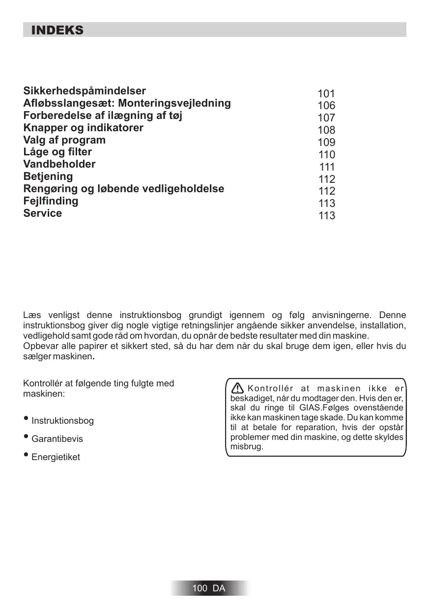 Læs venligst denne instruktionsbog grundigt igennem og følg anvisningerne. Denne instruktionsbog giver dig nogle vigtige retningslinjer angående sikker anvendelse, installation, vedligehold samt gode råd om hvordan, du opnår de bedste resultater med din maskine. Opbevar alle papirer et sikkert sted, så du har dem når du skal bruge dem igen, eller hvis du sælger maskinen. Kontrollér at følgende ting fulgte med maskinen: Kontrollér at maskinen ikke er beskadiget, når du modtager den. Hvis den er, skal du ringe til GIAS.Følges ovenstående ikke kan maskinen tage skade. Du kan komme til at betale for reparation, hvis der opstår problemer med din maskine, og dette skyldes misbrug.