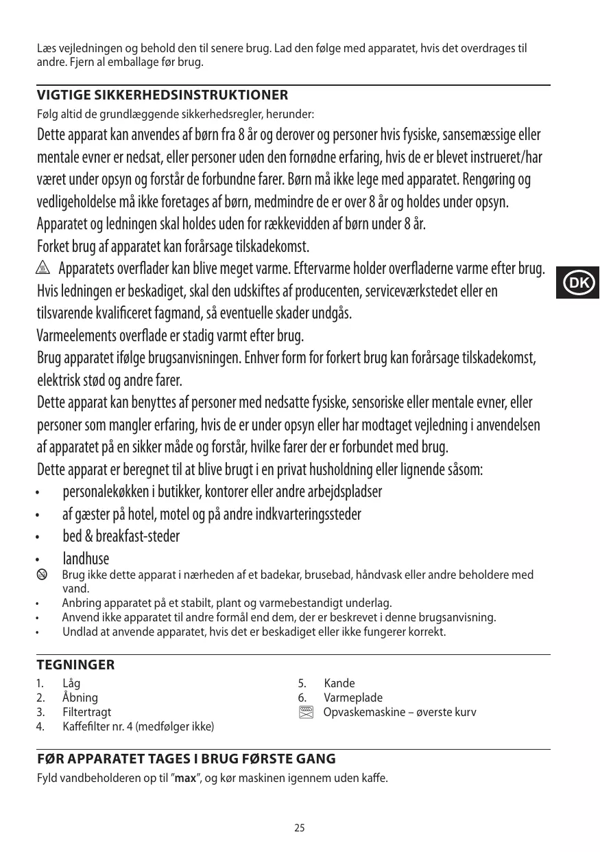 Dette apparat kan anvendes af børn fra 8 år og derover og personer hvis fysiske, sansemæssige eller mentale evner er nedsat, eller personer uden den fornødne erfaring, hvis de er blevet instrueret/har været under opsyn og forstår de forbundne farer. Børn må ikke lege med apparatet. Rengøring og vedligeholdelse må ikke foretages af børn, medmindre de er over 8 år og holdes under opsyn. Apparatet og ledningen skal holdes uden for rækkevidden af børn under 8 år. Forket brug af apparatet kan forårsage tilskadekomst. h Apparatets overflader kan blive meget varme. Eftervarme holder overfladerne varme efter brug. Hvis ledningen er beskadiget, skal den udskiftes af producenten, serviceværkstedet eller en tilsvarende kvalificeret fagmand, så eventuelle skader undgås. Varmeelements overflade er stadig varmt efter brug. Brug apparatet ifølge brugsanvisningen. Enhver form for forkert brug kan forårsage tilskadekomst, elektrisk stød og andre farer. Dette apparat kan benyttes af personer med nedsatte fysiske, sensoriske eller mentale evner, eller personer som mangler erfaring, hvis de er under opsyn eller har modtaget vejledning i anvendelsen af apparatet på en sikker måde og forstår, hvilke farer der er forbundet med brug. Dette apparat er beregnet til at blive brugt i en privat husholdning eller lignende såsom: • personalekøkken i butikker, kontorer eller andre arbejdspladser • af gæster på hotel, motel og på andre indkvarteringssteder • bed & breakfast-steder • landhuse b