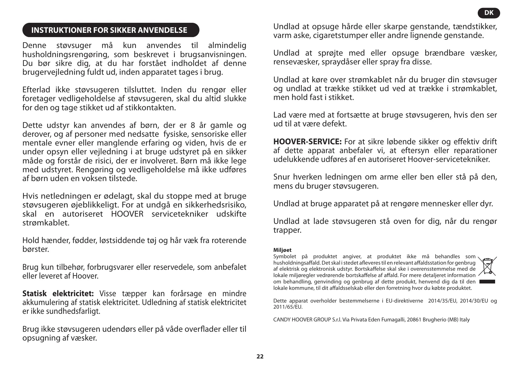 HE105HM - Støvsuger HOOVER - Notice d'utilisation et mode d'emploi gratuit