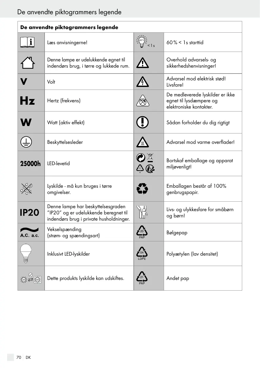 Denne lampe er udelukkende egnet til indendørs brug, i tørre og lukkede rum.