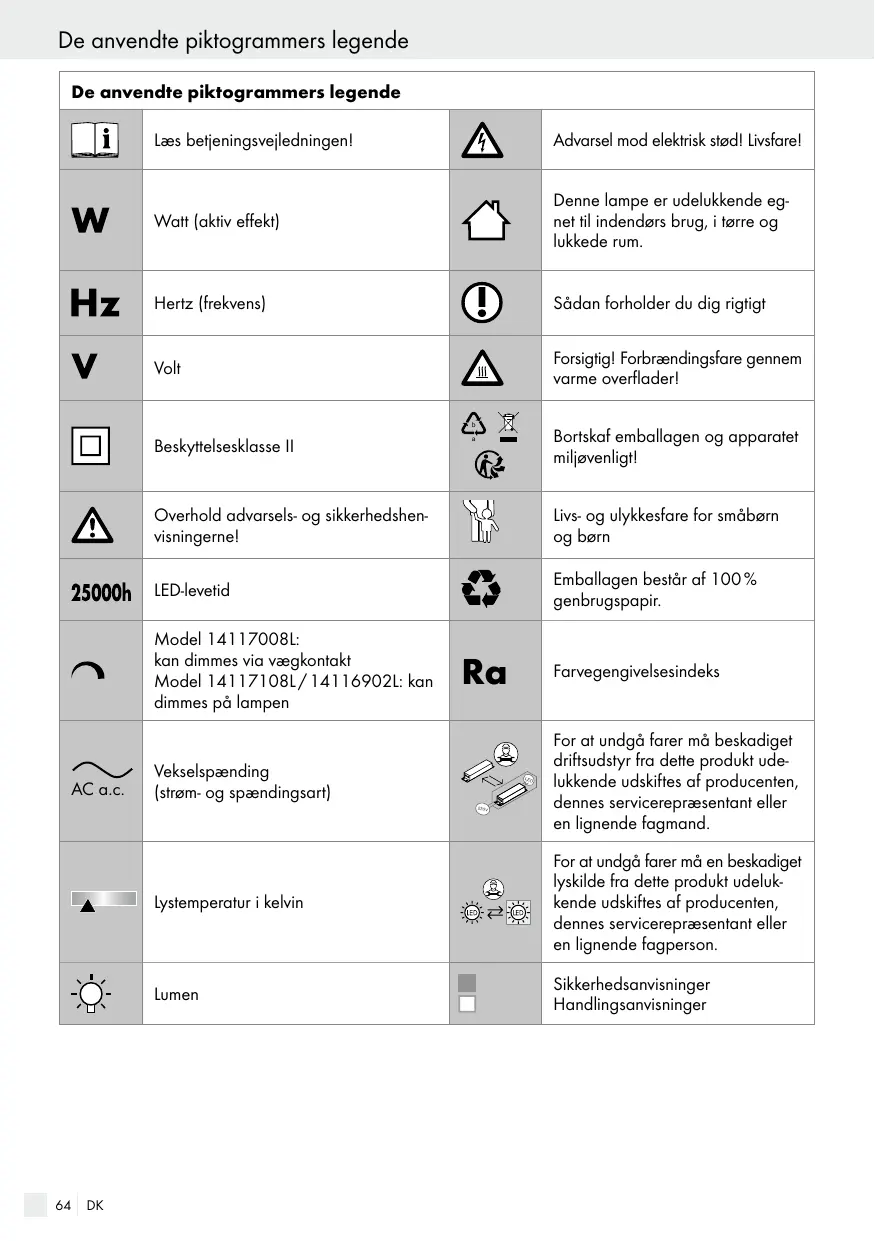 For at undgå farer må en beskadiget lyskilde fra dette produkt udelukkende udskiftes af producenten, dennes servicerepræsentant eller en lignende fagperson.