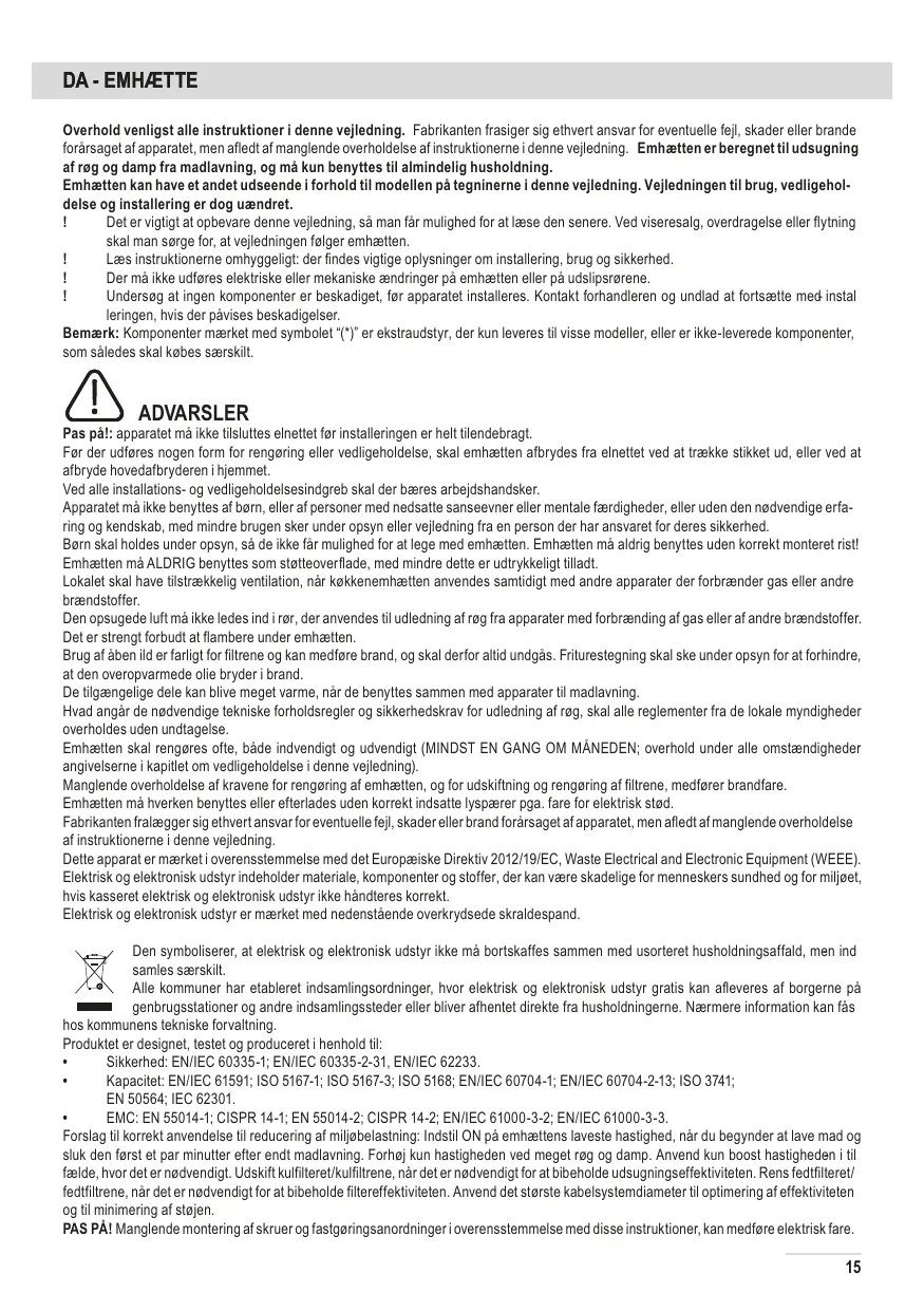 • Sécurité : EN/CEI 60335-1; EN/CEI 60335-2-31, EN/CEI 62233. UTILISATION La hotte est réalisée de façon qu’elle puisse être utilisée en version aspirante à évacuation extérieure, ou filtrante à recyclage intérieur.