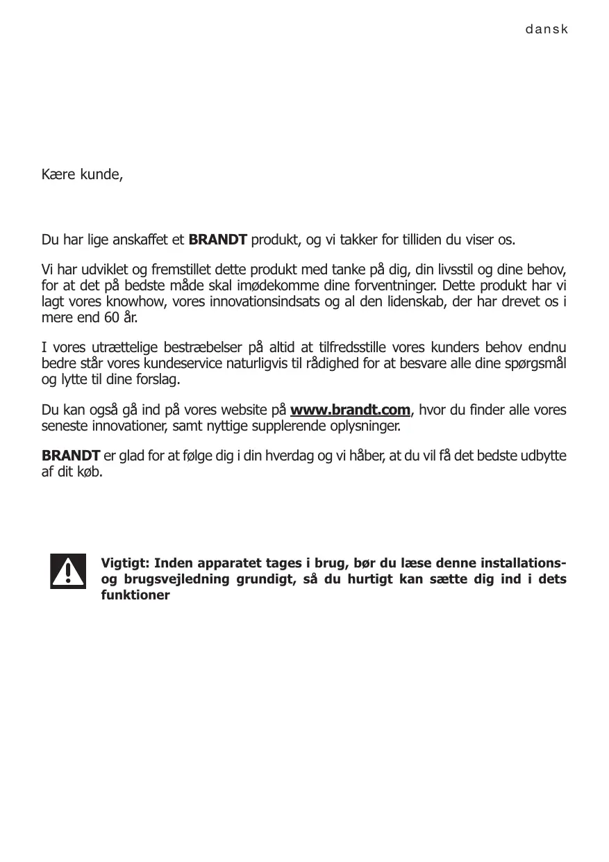 Du kan også gå ind på vores website på www.brandt.com, hvor du finder alle vores seneste innovationer, samt nyttige supplerende oplysninger.
