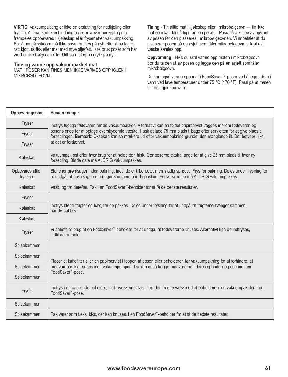 Opbevaringssted | Bemaærkninger frysen Indfrys fugtige fadevarer, far de vakuumpakkes. Alternativt kan en foldet papirserviet lægges mellem fadevaren og Re posens ende for at optage overskydende væske. Husk at lade 75 mm plads tilbage efter servietten for at give plads til v forseglingen. Bemærk: Oksekad kan se markere ud efter vakuumpakning grundet den manglende it. Det betyder ikke, GE at det er fordærvet. us Vakuumpak ost efter hver brug for at holde den frisk. Gar poseme ekstra lange for at give 25 mm plads til hver ny. forsegling. Blade oste mà ALDRIG vakuumpakkes. Opbevares altidi | Blancher grantsager inden pakning, indtl de er tilberedte, men stadig sprode. Frys far pakning. Deles under frysning for fiyseren at undgä, at grantsageme hænger sammen, nâr de pakkes. Friske svampe mâ ALDRIG vakuumpakkes. Koleskab Vask, og tar derefter. Pak i en FoodSaver”-beholder for at fà de bedste resultater. Fryser ED Indfrys blode frugter og bær, far de pakkes. Deles under frysning for at undgä, at frugteme hænger sammen, när de pakkes. Koleskab Res Vi anbefaler brug af en FoodSaver”-beholder for at undgä, at fadevareme knuses. Altemativt kan de indfryses,