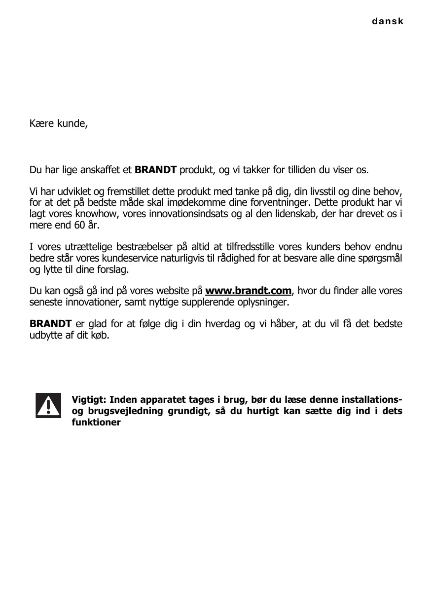 dansk Kære kunde, Du har lige anskaffet et BRANDT produkt, og vi takker for tilliden du viser os. Vi har udviklet og fremstillet dette produkt med tanke pà dig, din livsstil og dine behov, for at det pà bedste mâde skal imgdekomme dine forventninger. Dette produkt har vi lagt vores knowhow, vores innovationsindsats og al den lidenskab, der har drevet os i mere end 60 är. I vores utrættelige bestræbelser pà altid at tilfredsstille vores kunders behov endnu bedre stär vores kundeservice naturligvis til râdighed for at besvare alle dine spargsmäl og lytte til dine forslag. Du kan ogsä gâ ind pà vores website pà www.brandt.com, hvor du finder alle vores seneste innovationer, samt nyttige supplerende oplysninger. BRANDT er glad for at falge dig i din hverdag og vi häber, at du vil fà det bedste udbytte af dit kob. Vigtigt: Inden apparatet tages i brug, bor du læse denne installations- og brugsveijledning grundigt, sâ du hurtigt kan sætte dig ind i dets funktioner