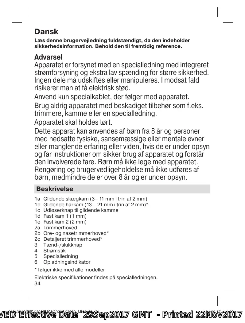 Brug aldrig apparatet med beskadiget tilbehgr som f.eks. trimmere, kamme eller en specialledning.