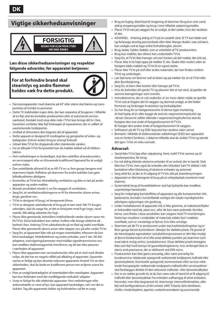 + Cette TV ne contient aucune pièce qui pourrait être réparée par l'utilisateur. En cas de défaut, contacter le fabricant ou l'agent autorisé qui assure le service après-vente. Le contact avec certaines parties situ- es à l'intérieur de la TV pourrait mettre votre vie en danger. La garantie ne couvre pas les défauts provoqués par des réparations effectuées par des tiers non autorisés.