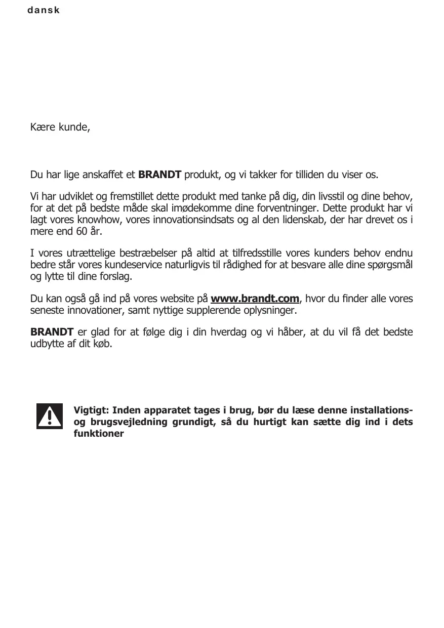 Du har lige anskaffet et BRANDT produkt, og vi takker for tilliden du viser os.