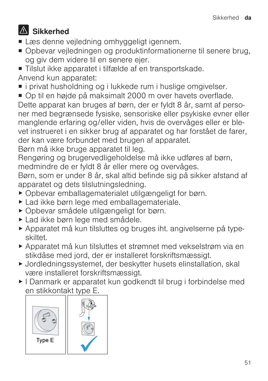 > | Danmark er apparatet kun godkendit til brug i forbindelse med en stikkontakt type E.