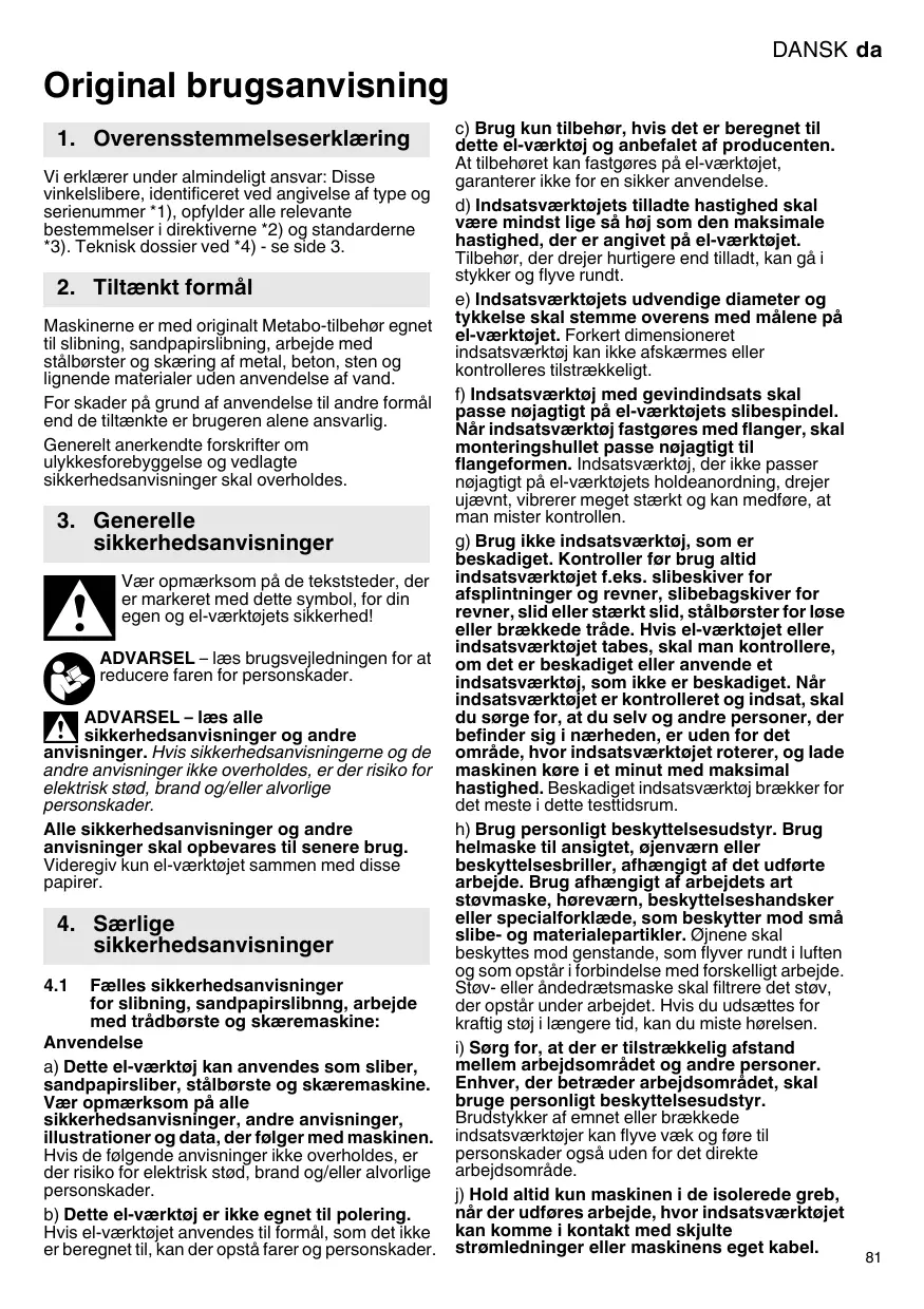 BRUGSANVISNING W 22-180 MVT W 22-230 MVT WE 22-180 MVT WE 22-230 MVT WE 22-230 MVT Quick METABO