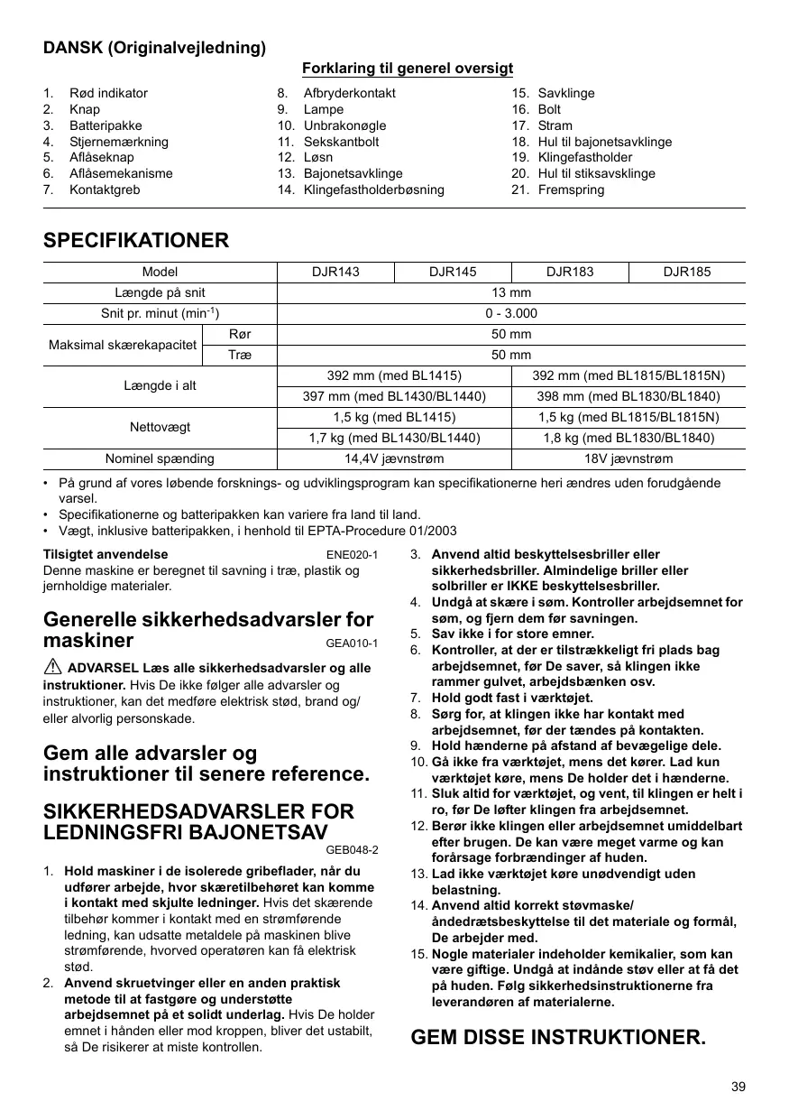 BRUGSANVISNING DJR143 DJR145 DJR183 DJR185 MAKITA
