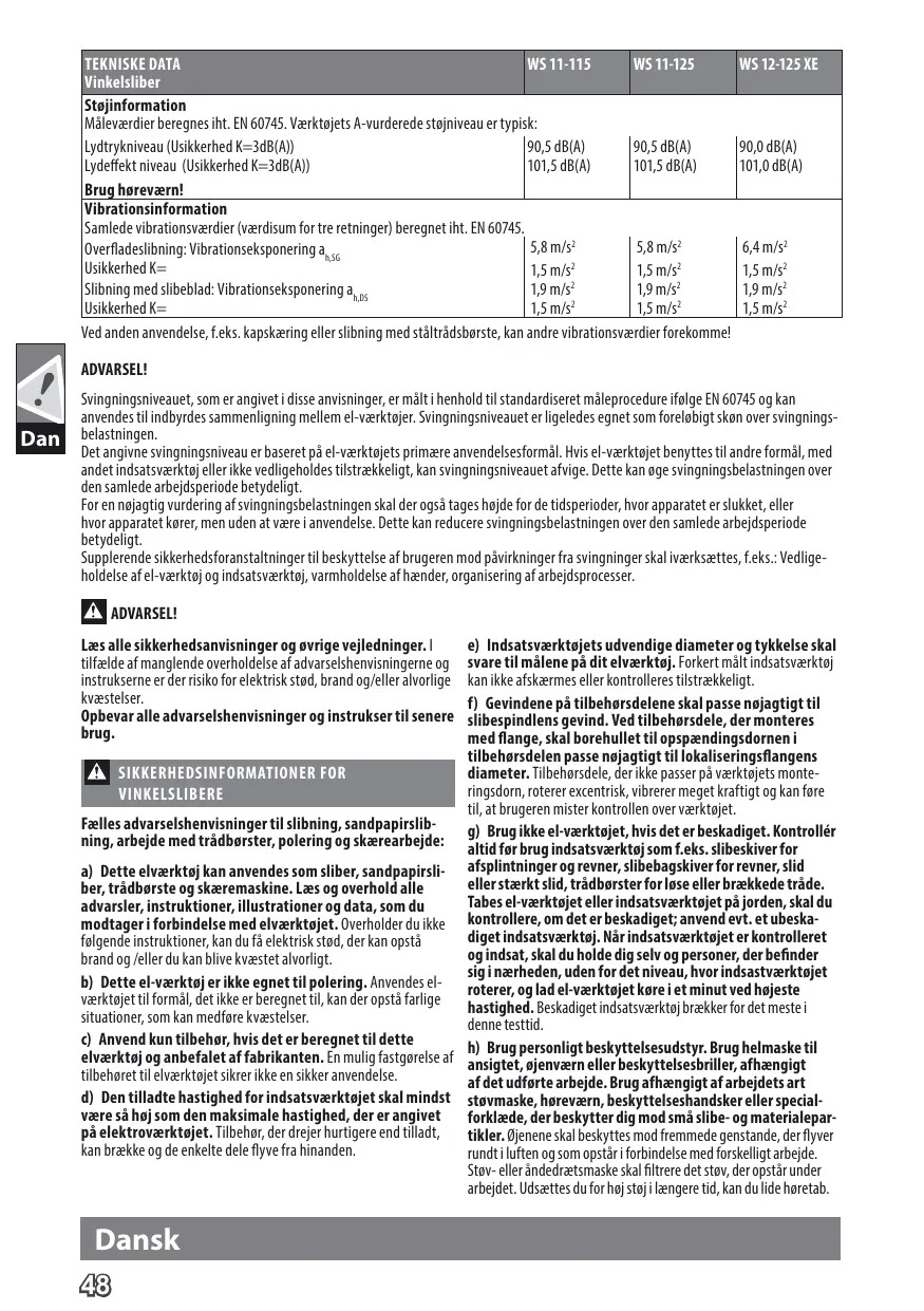 BRUGSANVISNING WS 9-100, WS 9-115, WS 9-125, WS 11-115, WS 11-125, WS 12-125 XE AEG